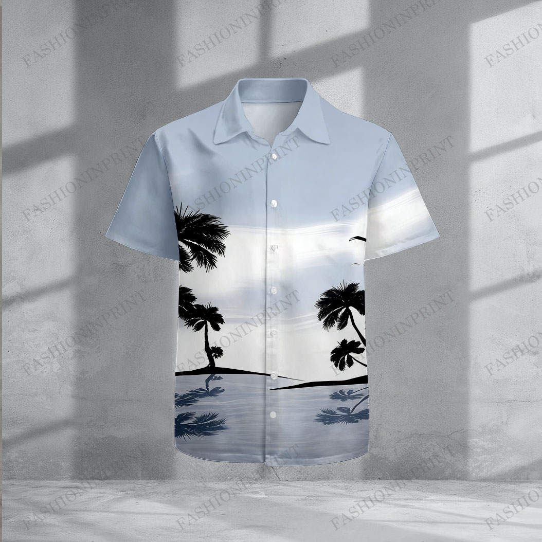 Men's Casual Gray Blue Color Matching Coconut Tree Print Short-Sleeve Shirt