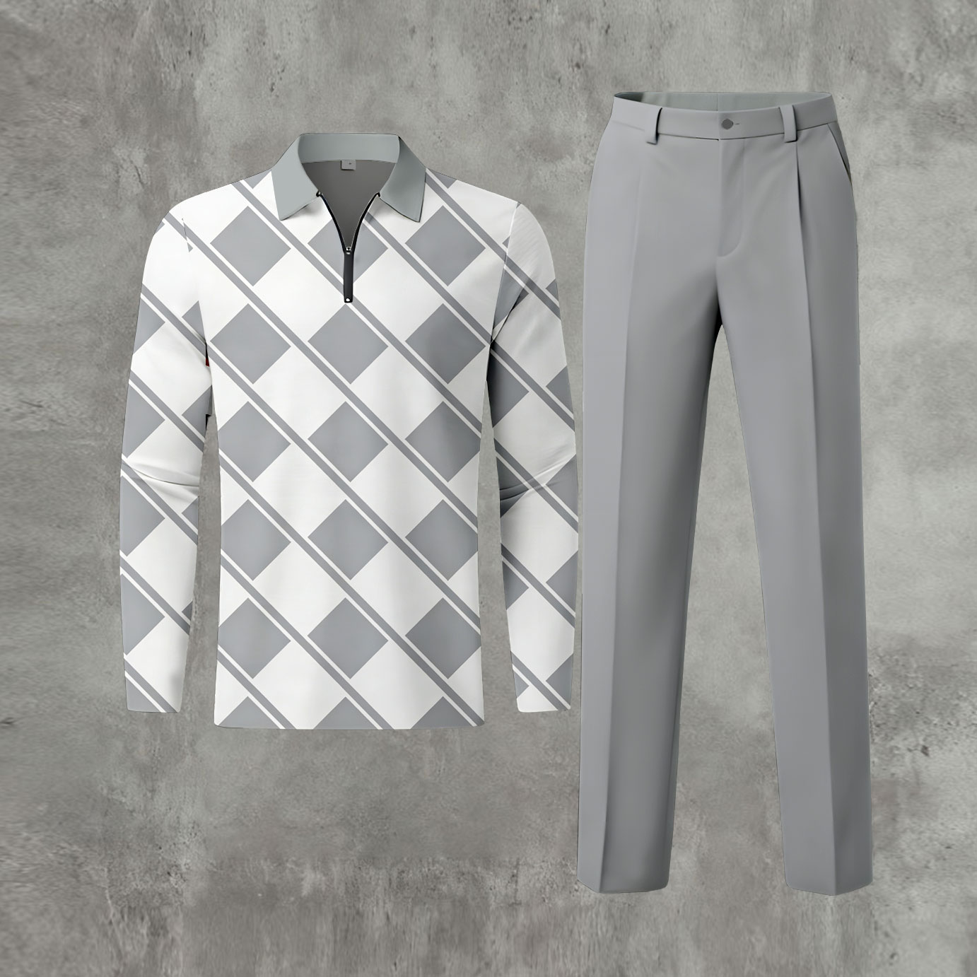 Men's Casual Gray & White Color Matching Checked Printed Polo-Collar Zipper Long Sleeved Trousers Two-Piece Set