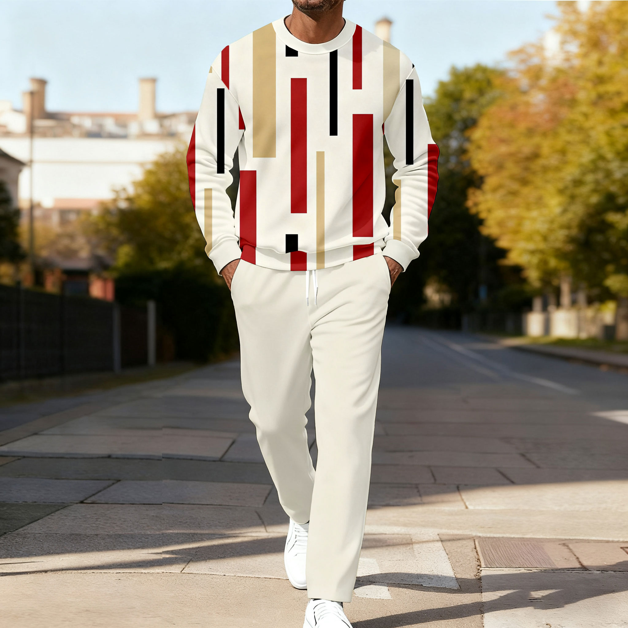 Men's Casual Color Matching Geometric Printed Round Long Sleeved Sweatshirt & Trousers Khaki Two-Piece Set