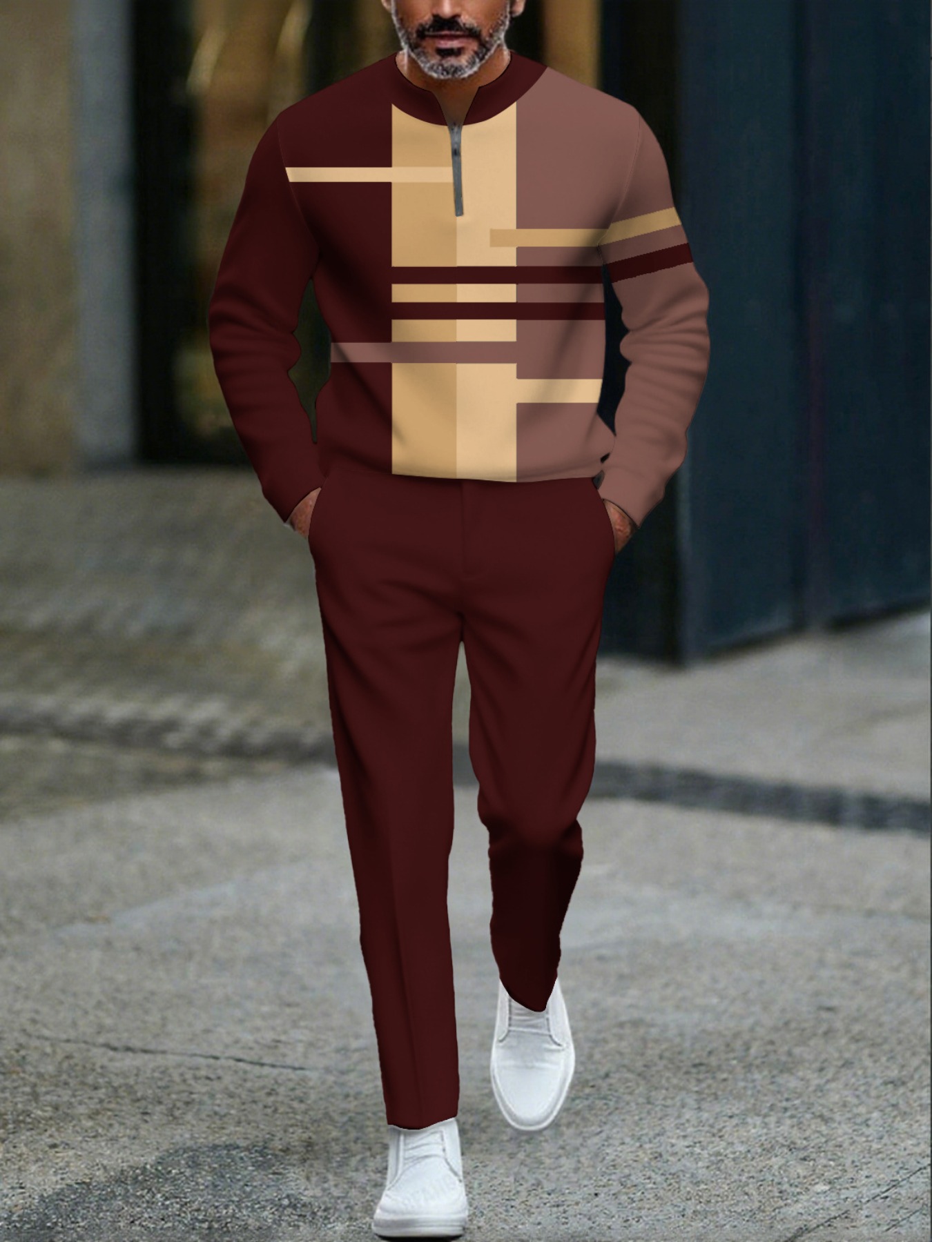 Men's Casual Maroon Multi Color Matching Geometric Printed Round-Neck Zipper Long Sleeved Tops & Trousers Two-Piece Set
