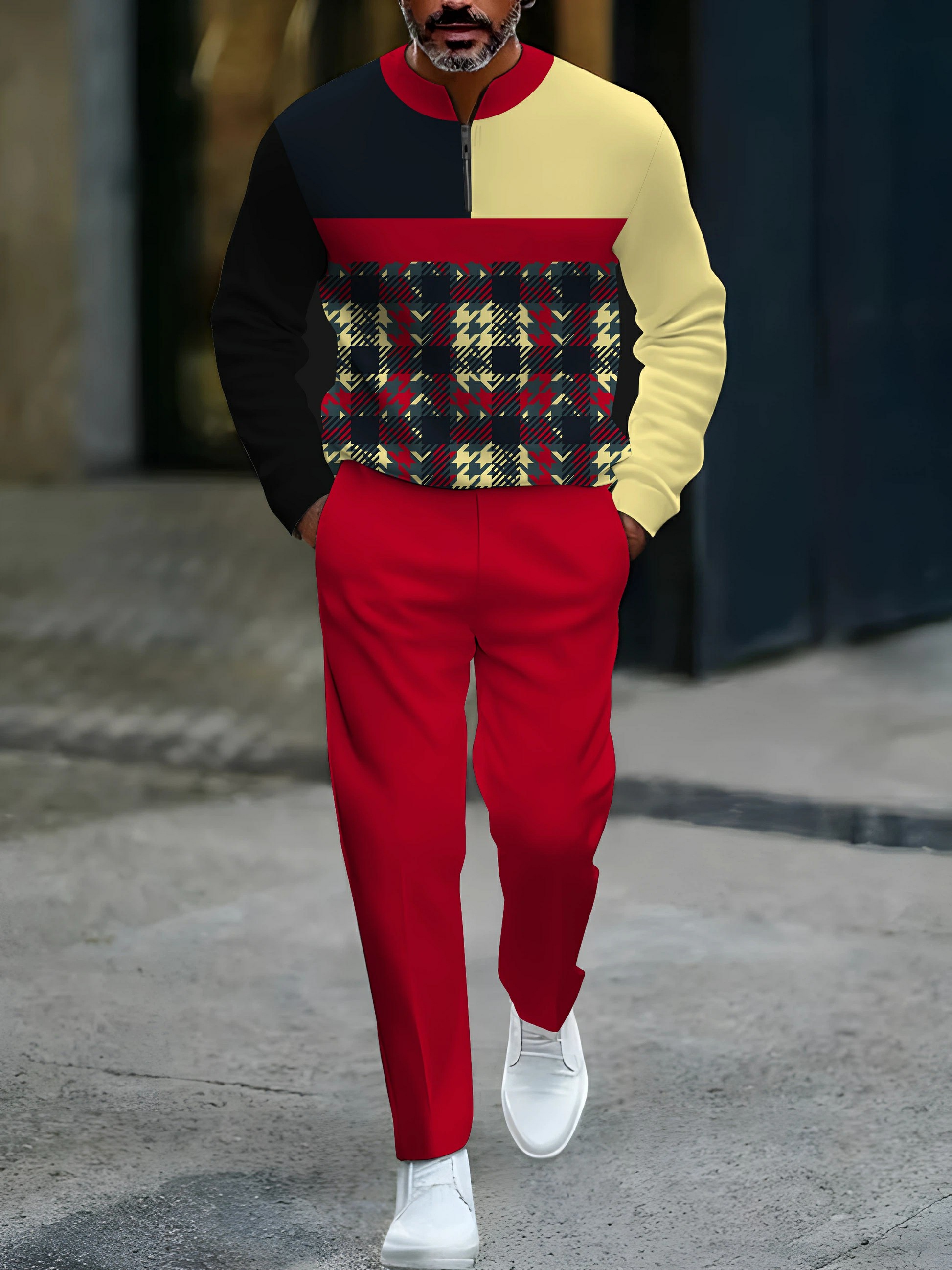 Men's Casual Red Yellow Navy Color Matching Geometric Printed Round-Neck Zipper Long Sleeved Tops & Trousers Two-Piece Set