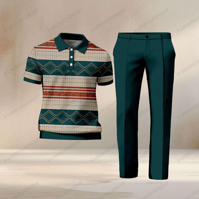 Men's Casual Dark Green & Red Color Matching Ethnic Style Striped Printed Short Sleeved Polo Shirt & Trousers Two-Piece Set