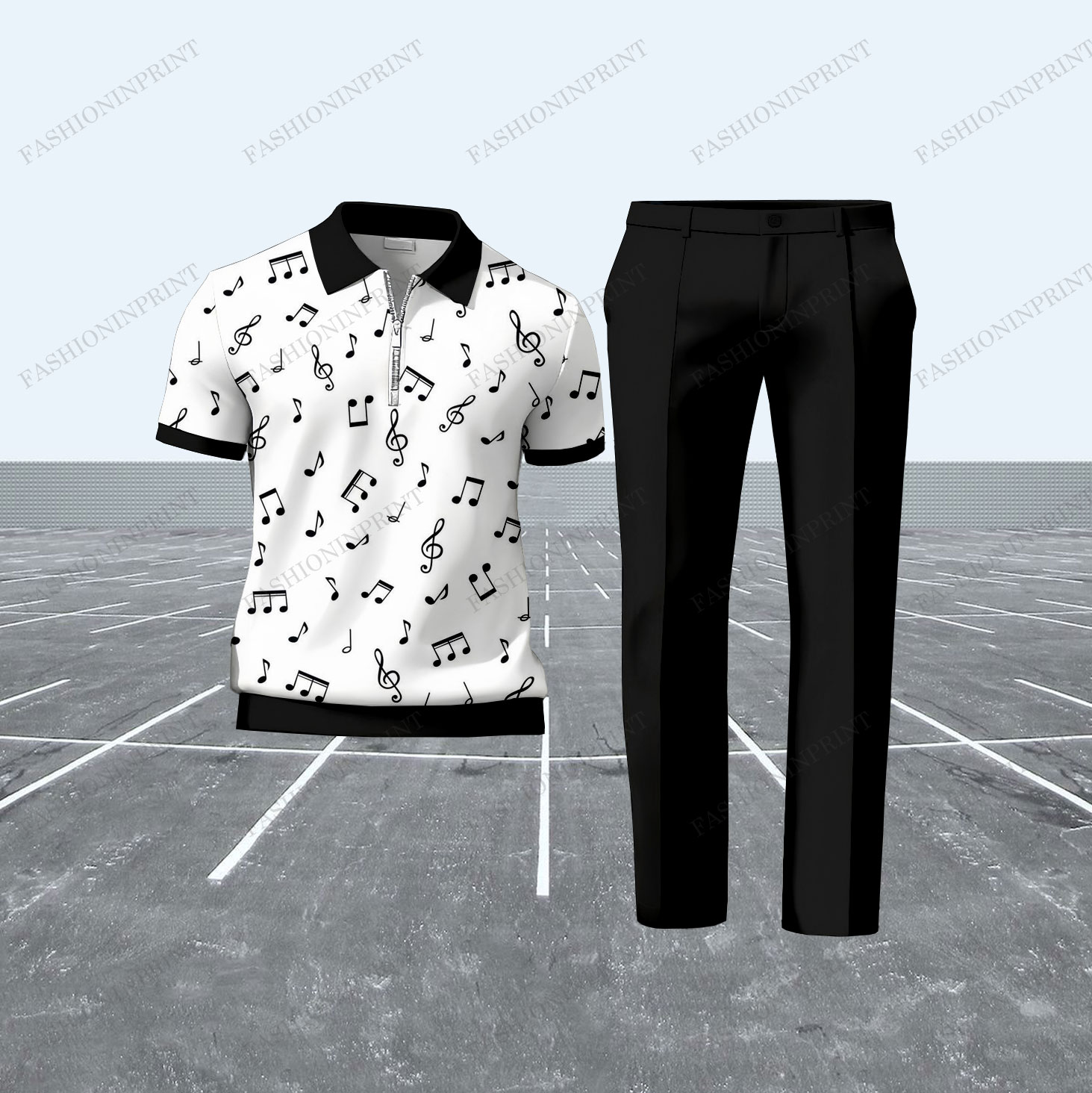 Men's Casual Color Matching Musical Note Printed Short Sleeved Polo Shirt & Trousers Two-Piece Set