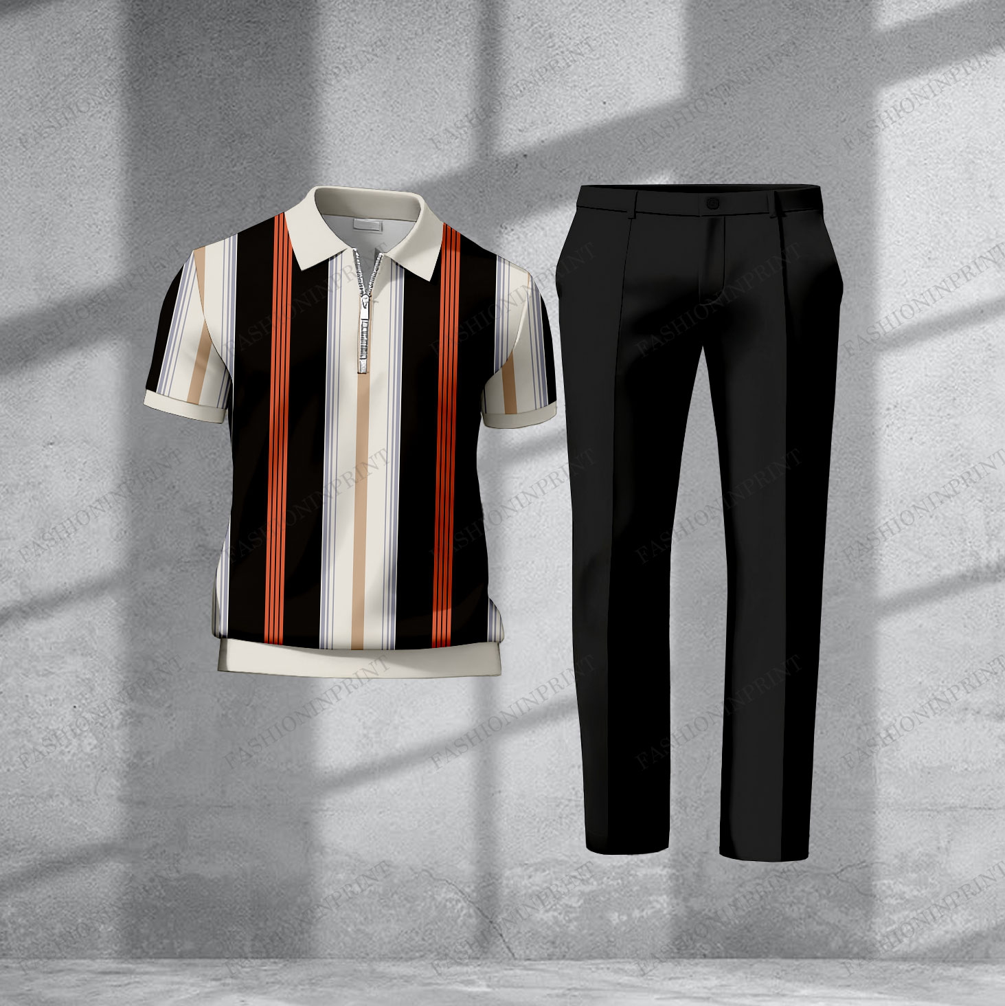 Men's Casual Black & Beige Color Matching Striped Printed Short Sleeved Polo Shirt & Trousers Two-Piece Set