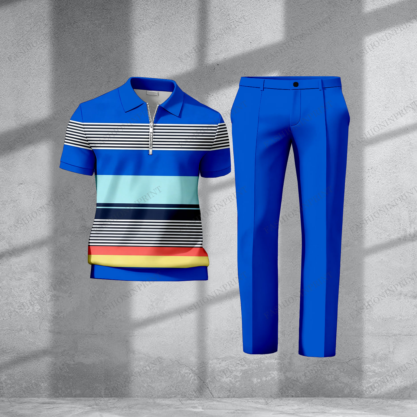 Men's Casual Royal Blue & Multi Color Matching Striped Printed Short Sleeved Polo Shirt & Trousers Two-Piece Set