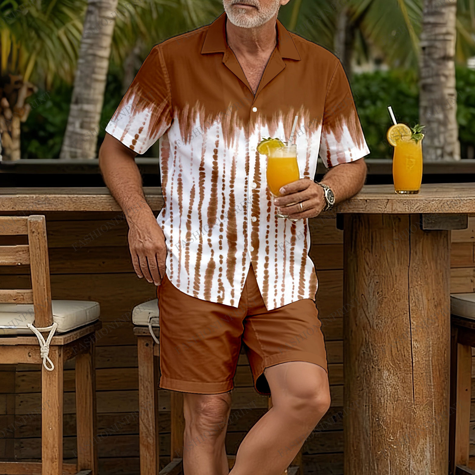 Men's Casual Brown & White Tie-diye Color Matching Hawaii Print Short-Sleeve Shirt & Shorts Two-Piece Set