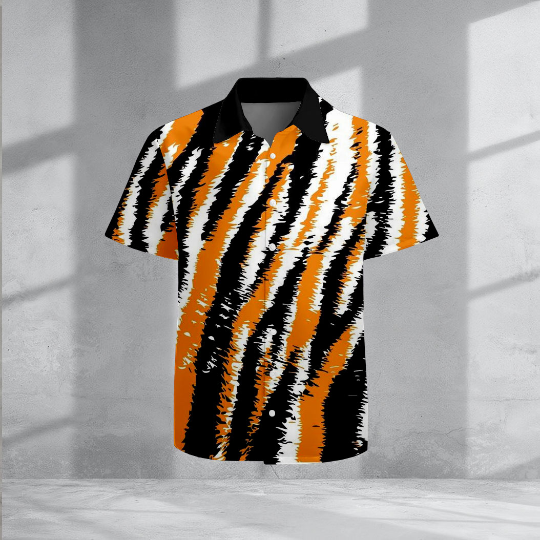 Men's Casual Orange & Black Color Matching Tiger Stripes Print Short-Sleeve Shirt