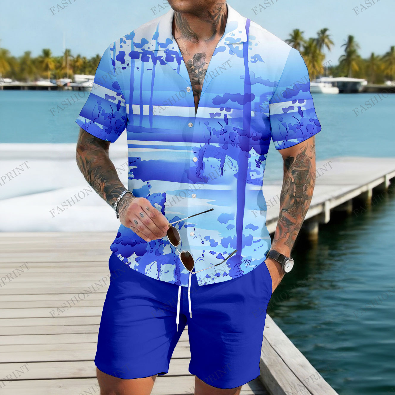 Men's Casual Royal Blue Gradient Color Matching Hawaii Print Short-Sleeve Shirt & Shorts Two-Piece Set