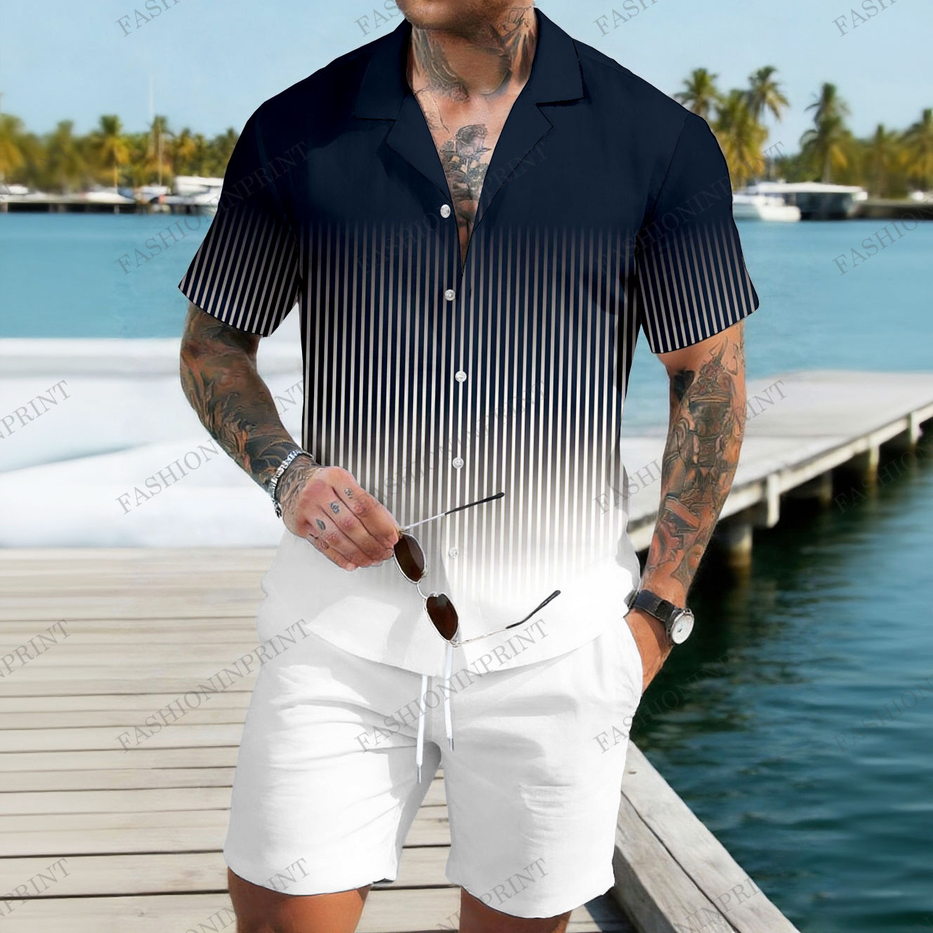 Men's Casual Navy Blue Gradient Color Matching Striped Print Short-Sleeve Shirt & Shorts Two-Piece Set