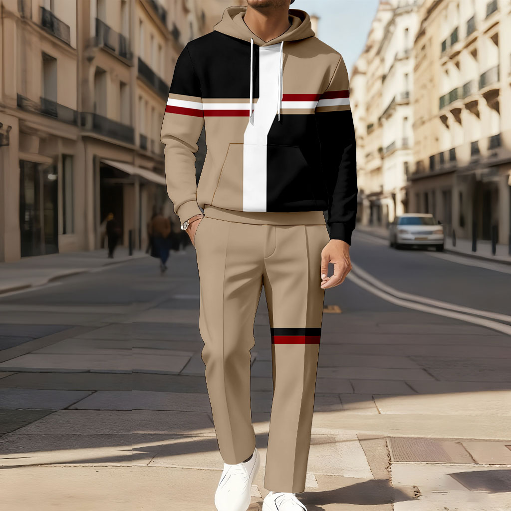 Men's Casual Color Matching Printed Long-Sleeved Hoodies Sweatshirt & Trousers Two-Piece Set