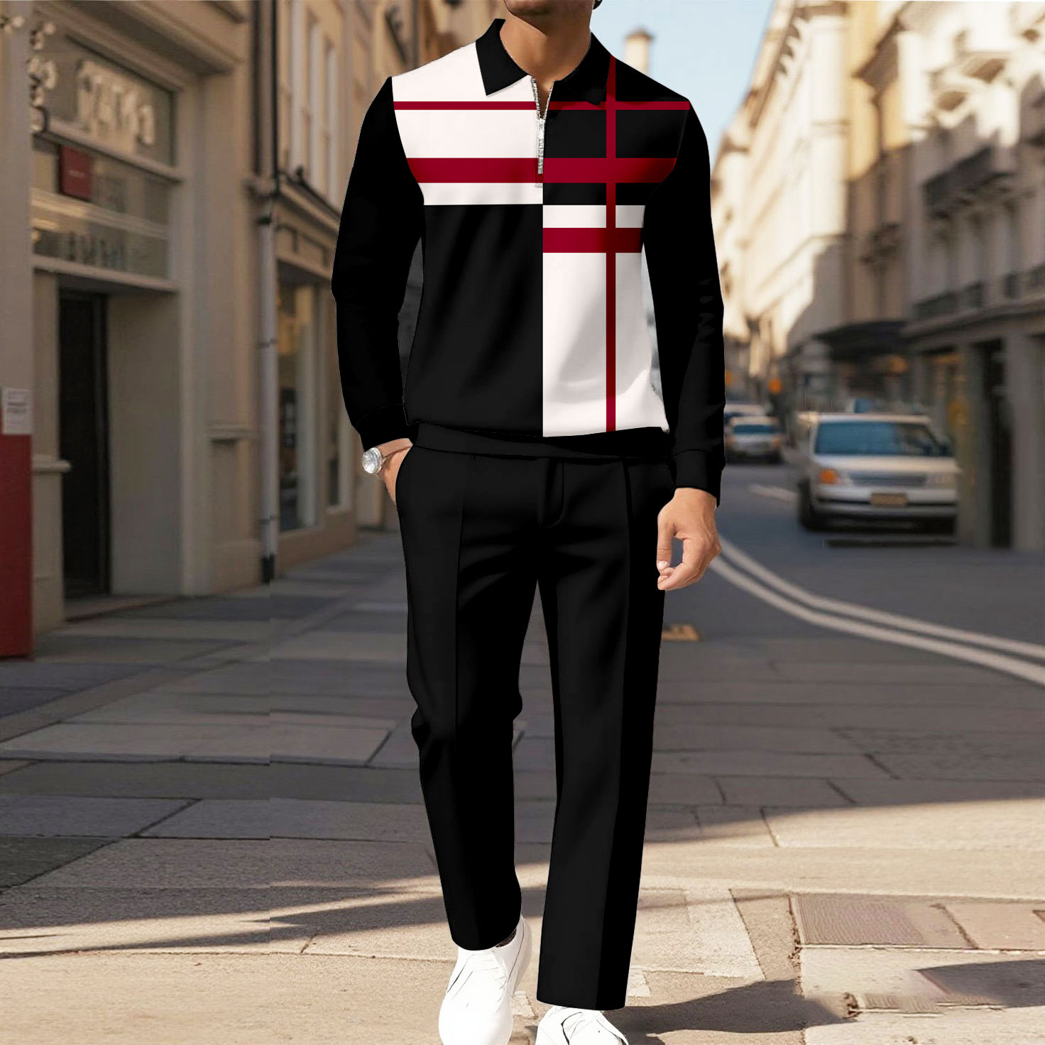 Men's Casual Color Matching Printed Polo-Collar Zipper Long Sleeved Trousers Black Two-Piece Set