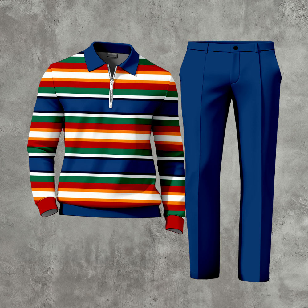 Men's Casual Royal Blue & Orange Color Matching Striped Printed Polo-Collar Zipper Long Sleeved Trousers Two-Piece Set