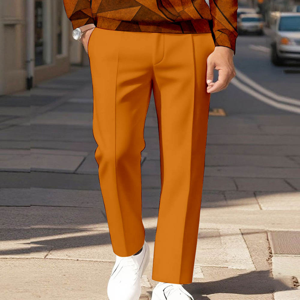 Men's Casual Color Matching Hand & Geometric Printed Polo-Collar Zipper Long Sleeved Trousers Orange Two-Piece Set