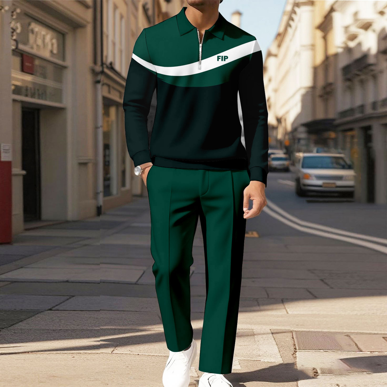 Men's Casual Color Matching Printed Polo-Collar Zipper Long Sleeved Trousers Dark Green Two-Piece Set