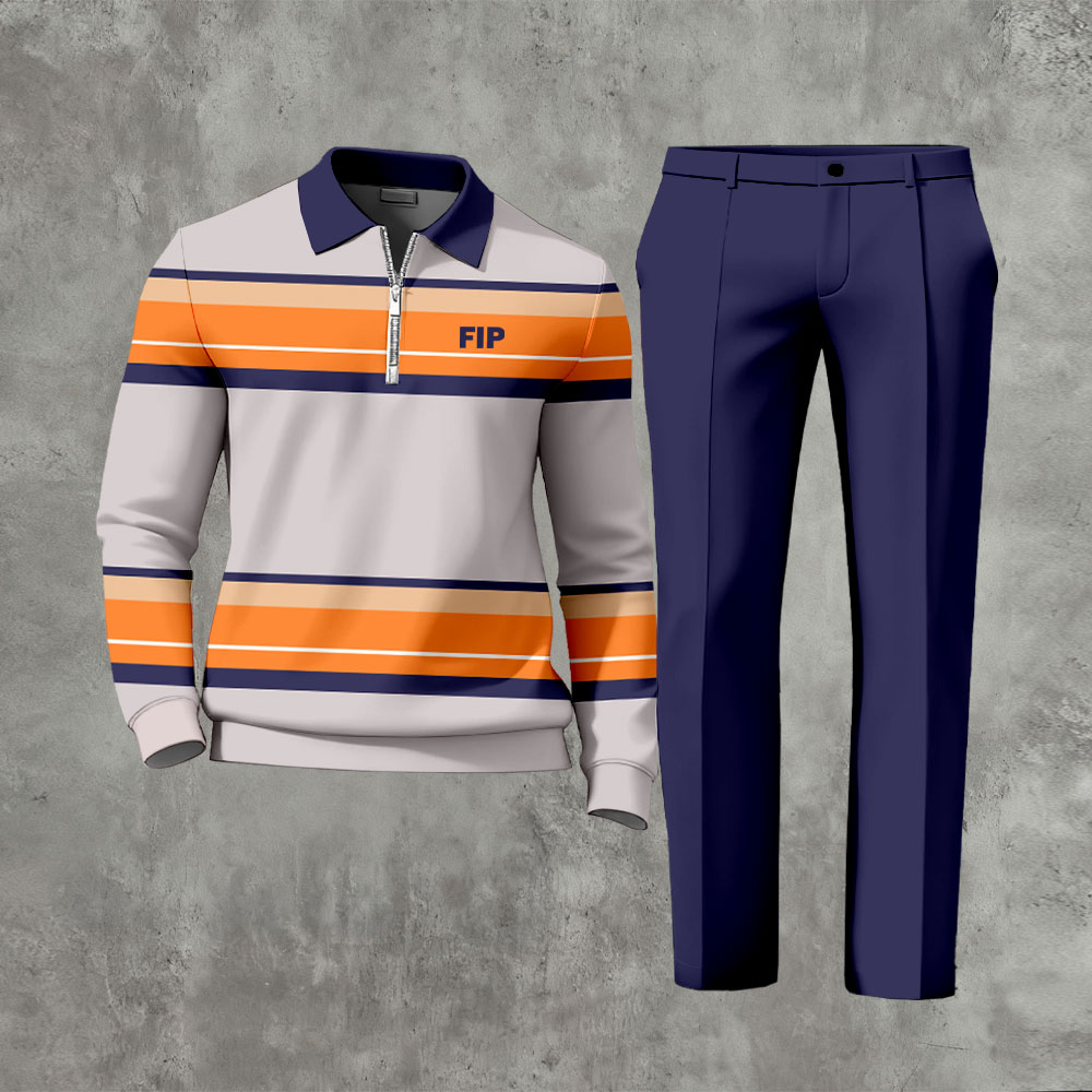 Men's Casual Orange & Purple Color Matching Striped Printed Polo-Collar Zipper Long Sleeved Trousers Two-Piece Set