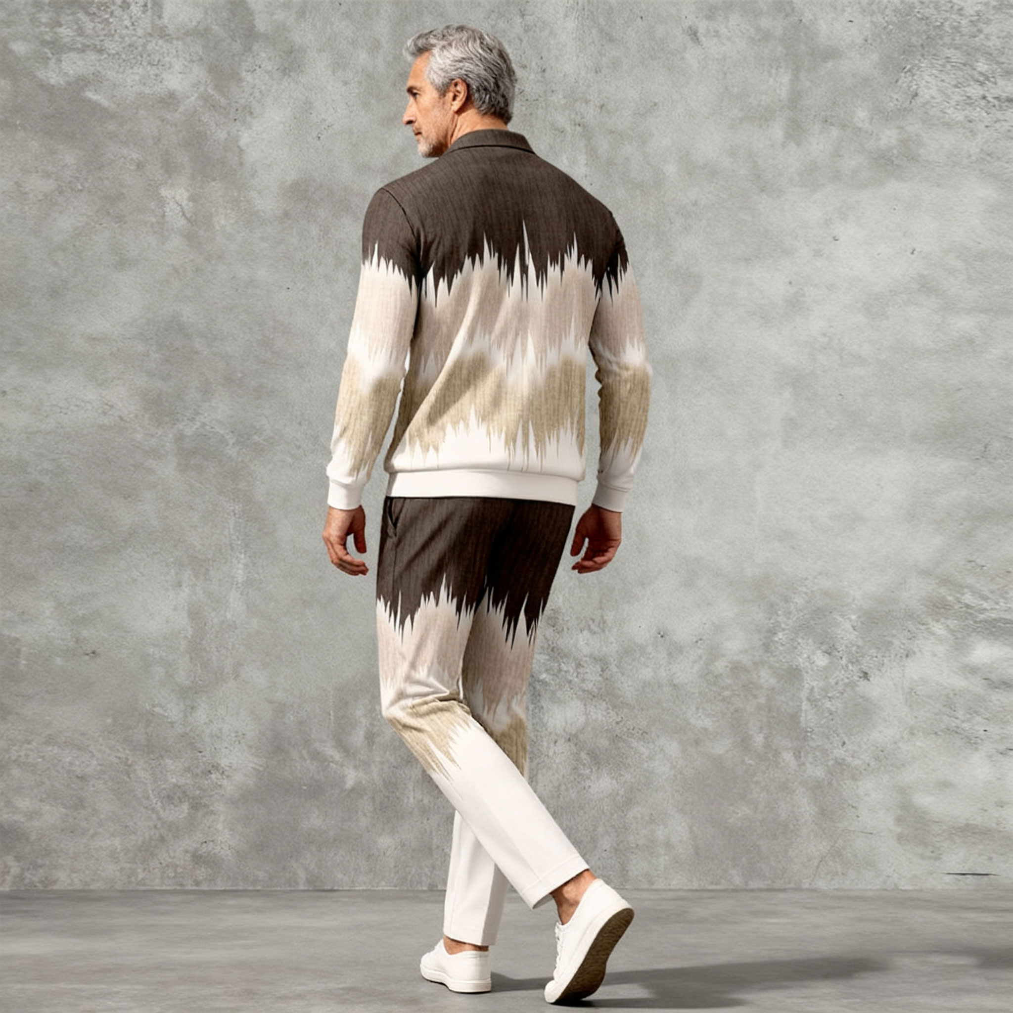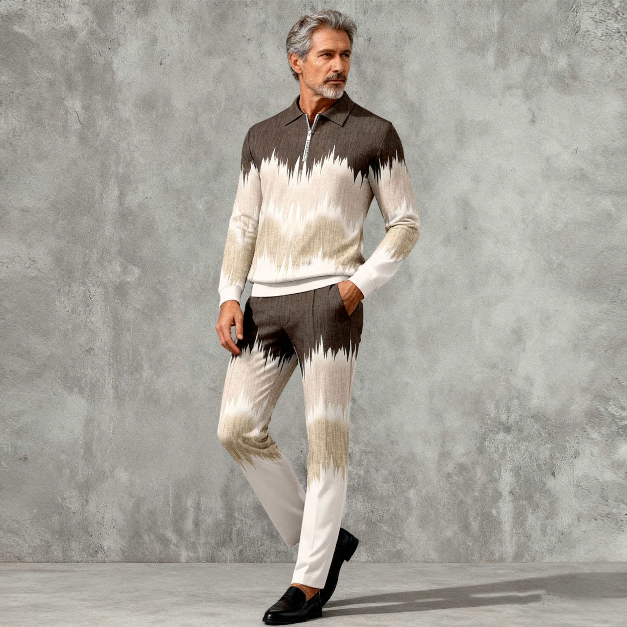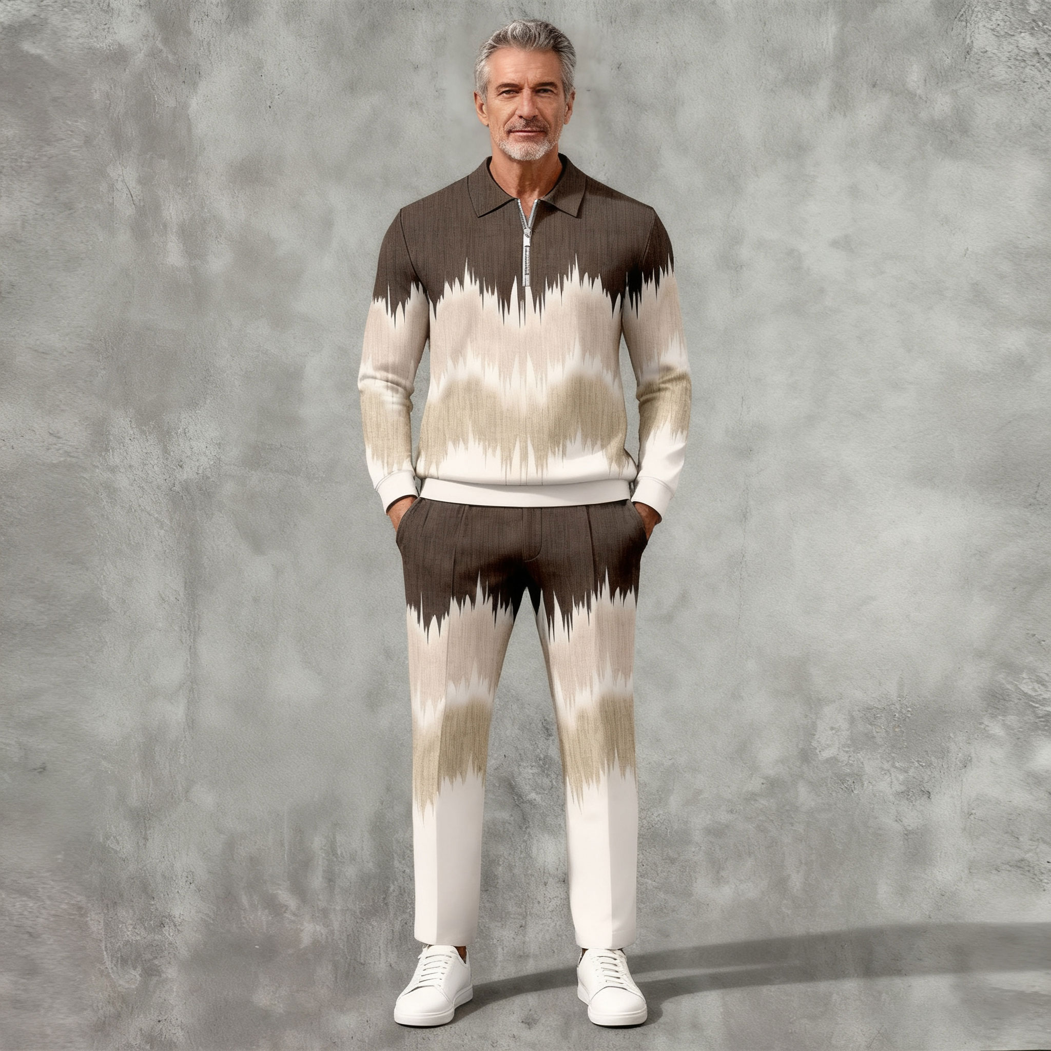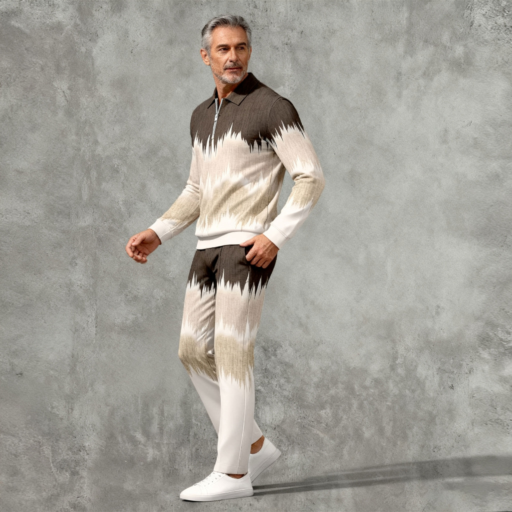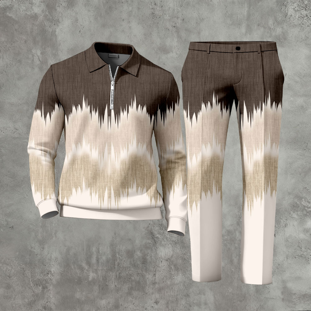 Men's Casual Color Matching Printed Polo-Collar Zipper Long Sleeved Trousers Two-Piece Set
