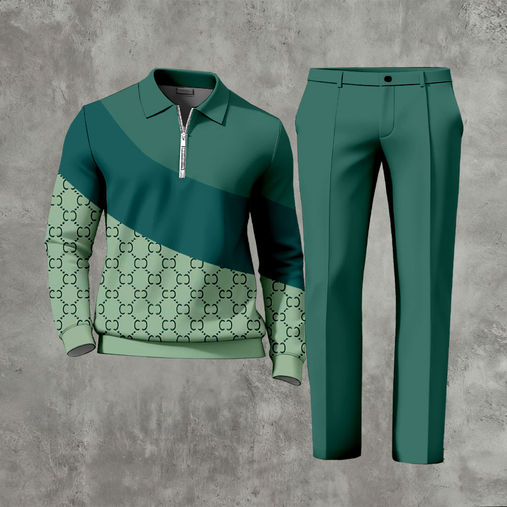 Men's Casual Green Color Matching Asymmetric Vintage Printed Polo-Collar Zipper Long Sleeved Trousers Two-Piece Set