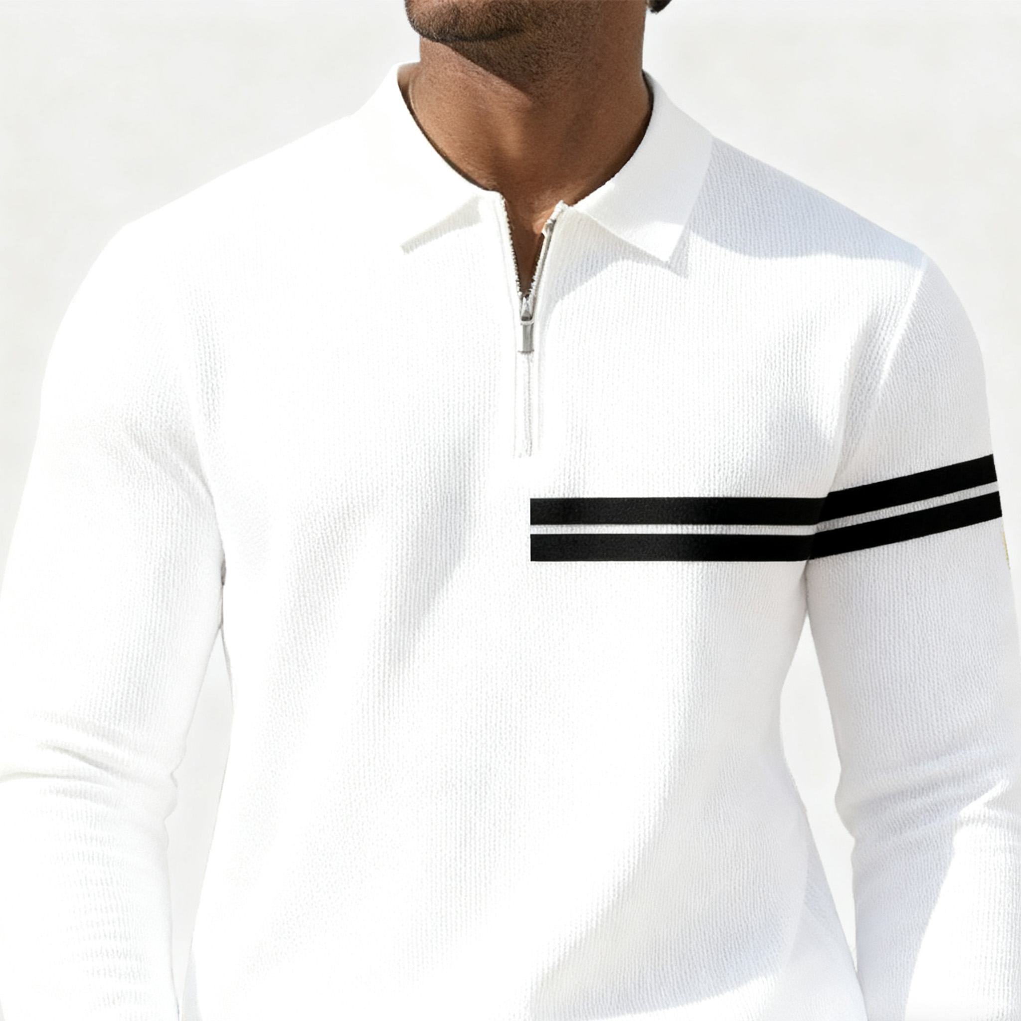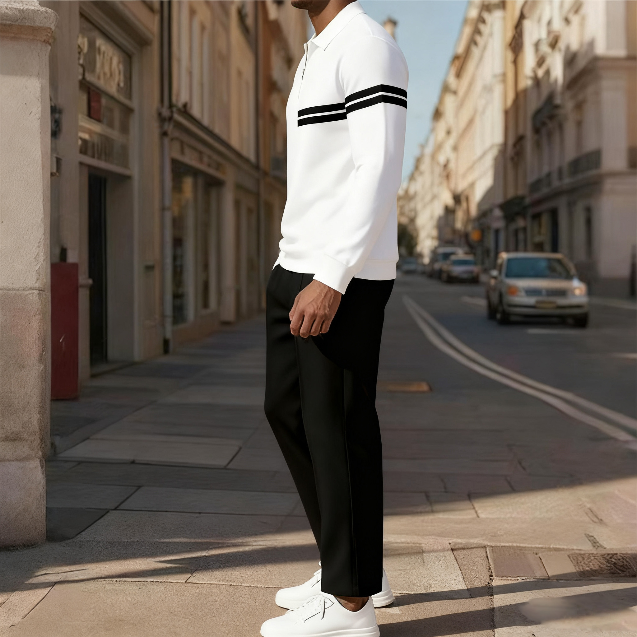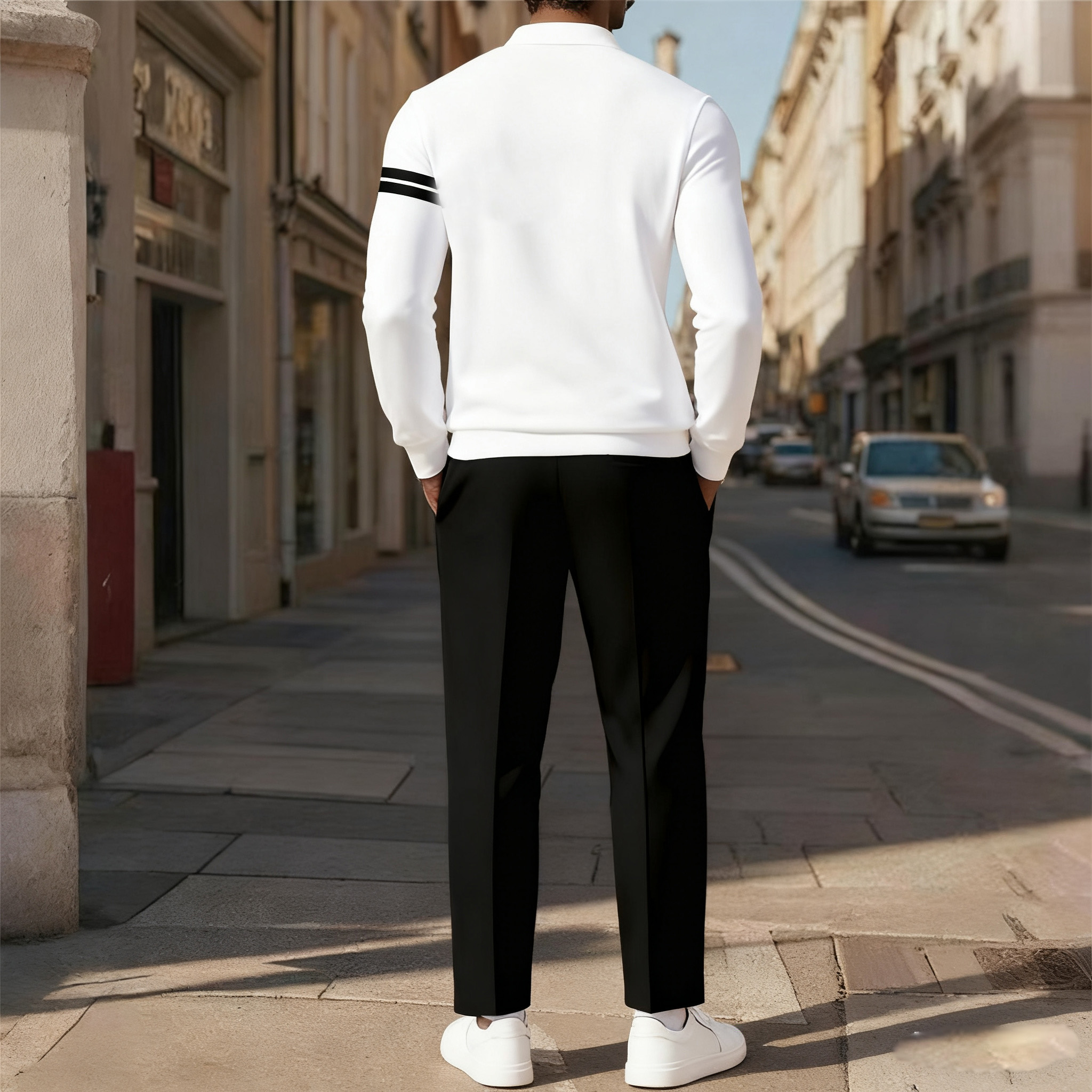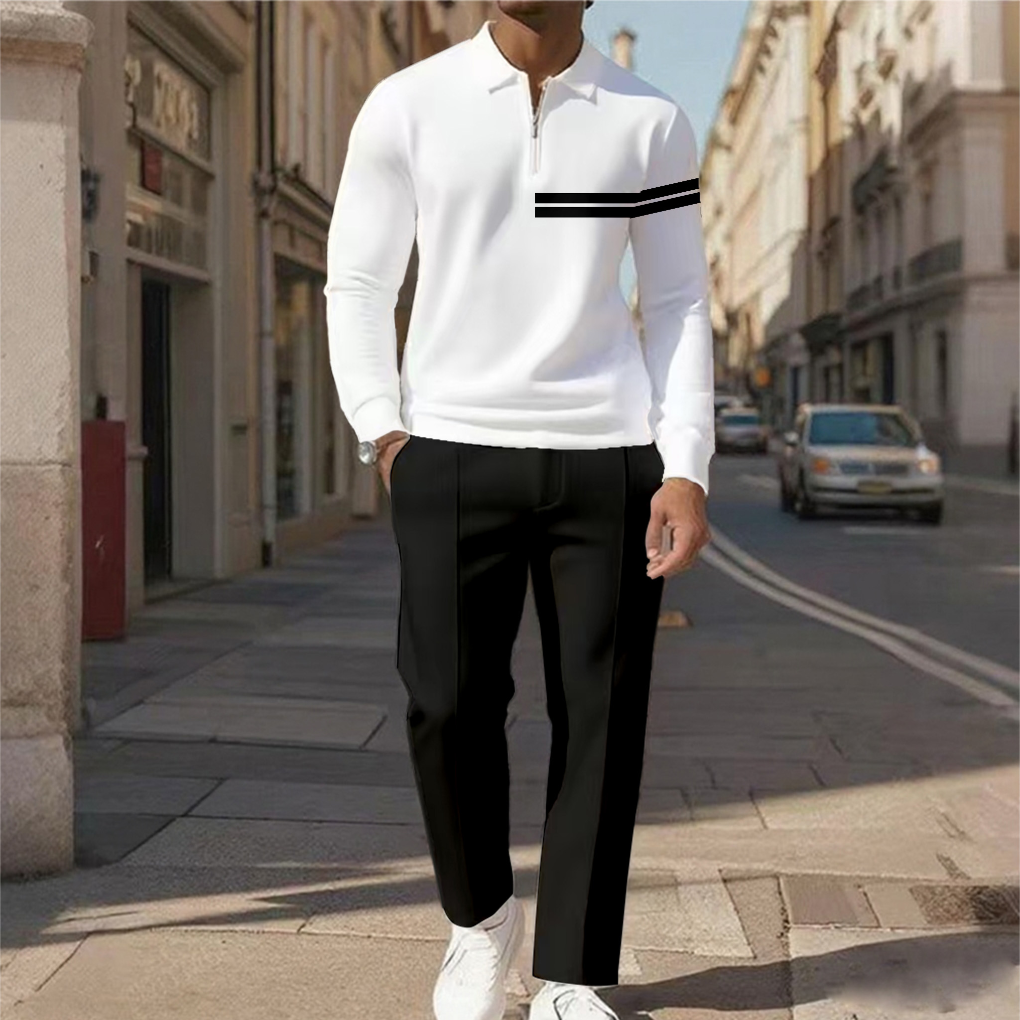 Men's Casual Color Matching Printed Polo-Collar Zipper Long Sleeved Trousers Two-Piece Set