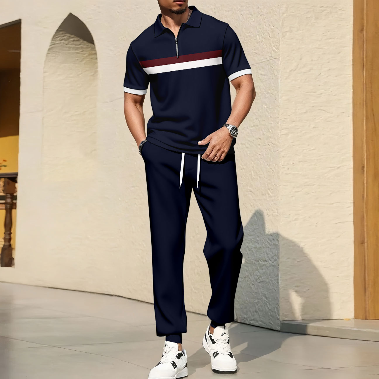 Men's Casual Color Matching Printed Polo-Collar Zipper Short Sleeved Trousers Two-Piece Set