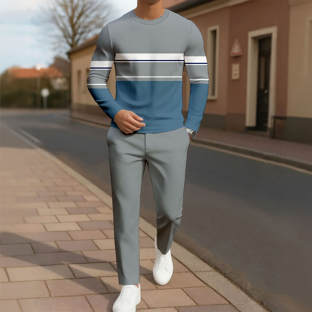 Men's Casual Color Matching Printed Round Neck Long Sleeved Trousers Two-Piece Set