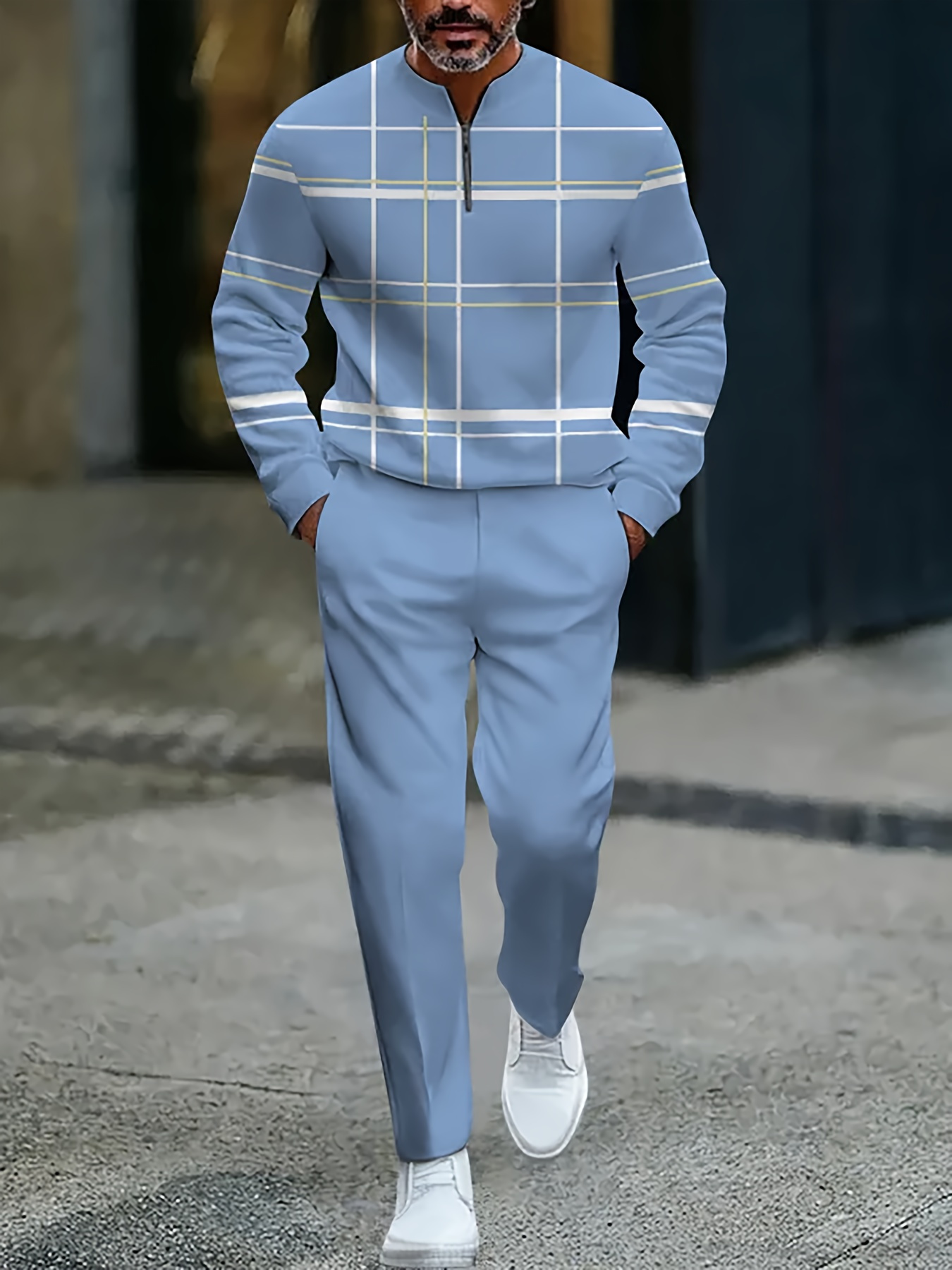 Men's Casual Color Matching Printed Round-Neck Zipper Long Sleeved Trousers Two-Piece Set