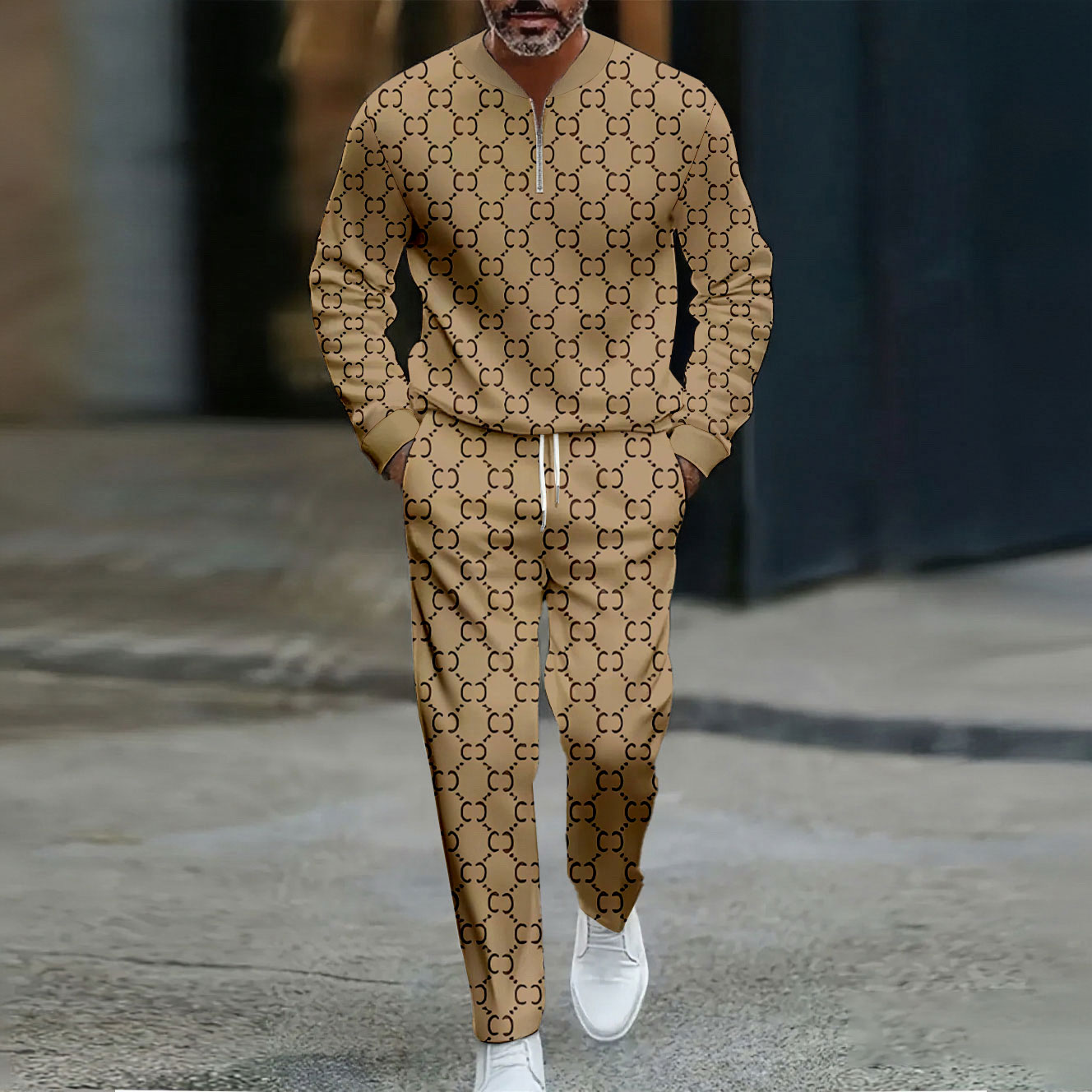Men's Casual Color Matching Printed Round-Neck Zipper Long Sleeved Trousers Two-Piece Set