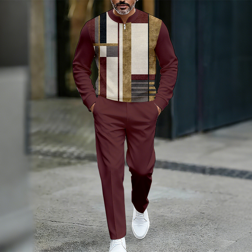Men's Casual Color Matching Printed Round-Neck Zipper Long Sleeved Trousers Two-Piece Set