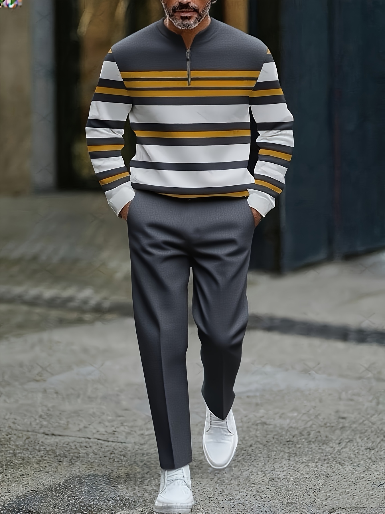 Men's Casual Color Matching Printed Round-Neck Zipper Long Sleeved Trousers Two-Piece Set