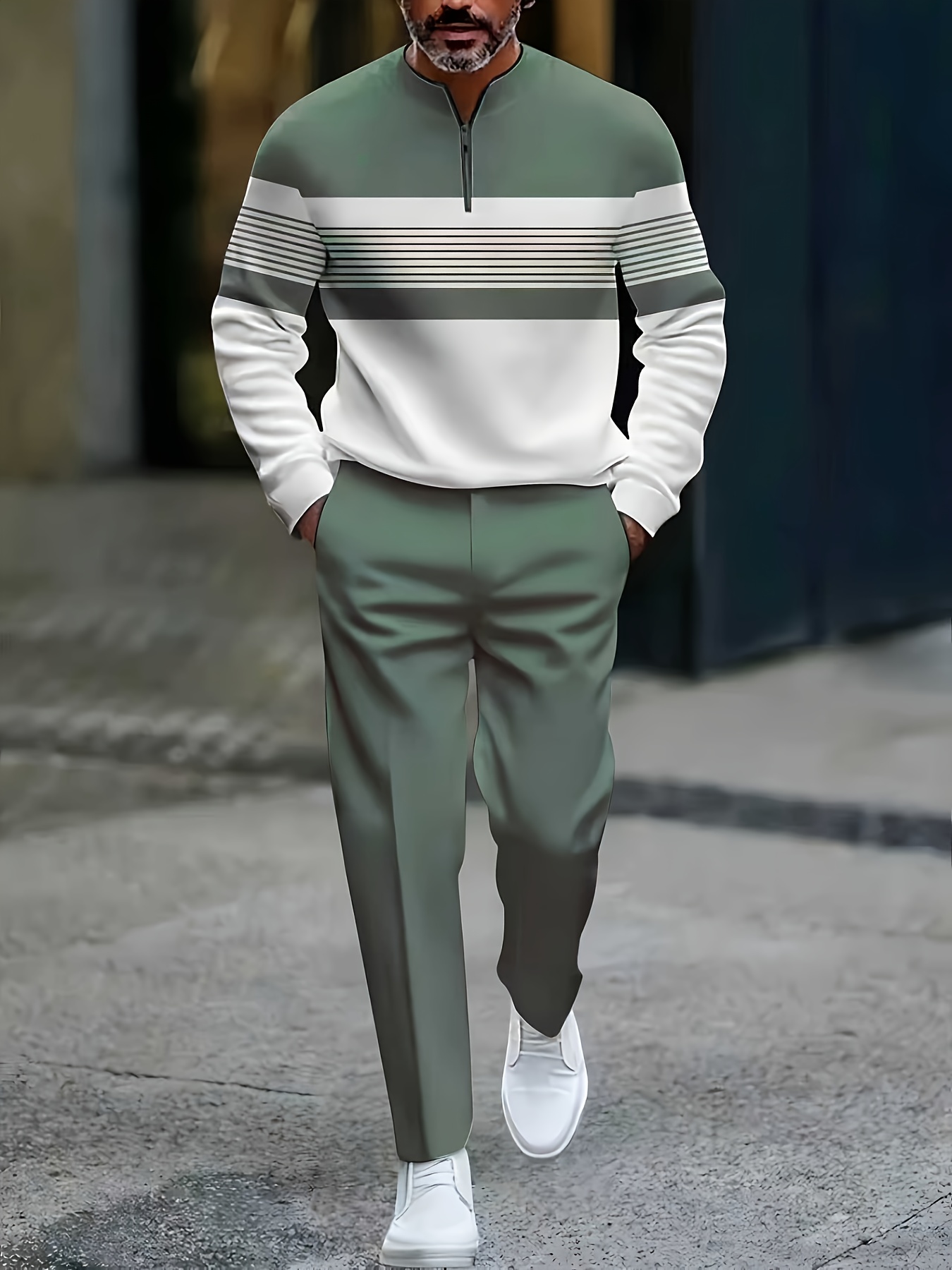 Men's Casual Color Matching Striped Printed Round-Neck Zipper Long Sleeved Trousers Grass Green Two-Piece Set