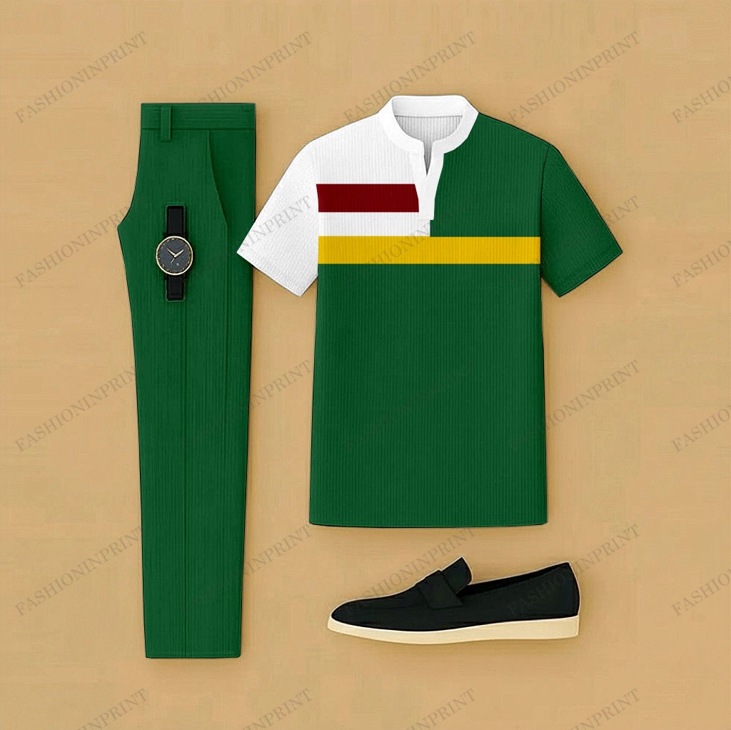 Men's Casual Green & White Color Matching Geometric Printed Short Sleeved Henry Collar T-Shirt & Trousers Two-Piece Set