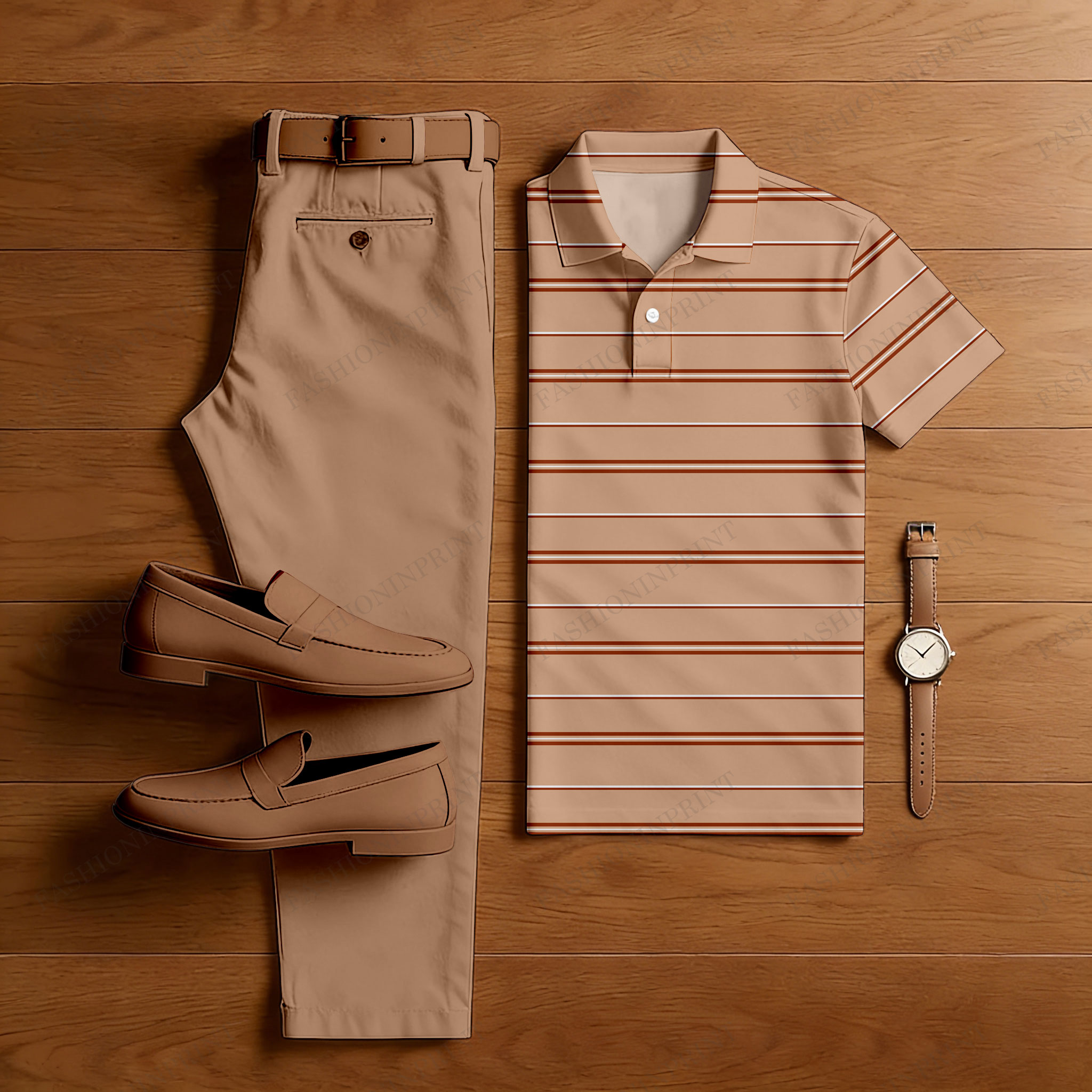 Men's Casual Orange Pink & Red Color Matching Striped Printed Short Sleeved Polo Shirt & Trousers Two-Piece Set