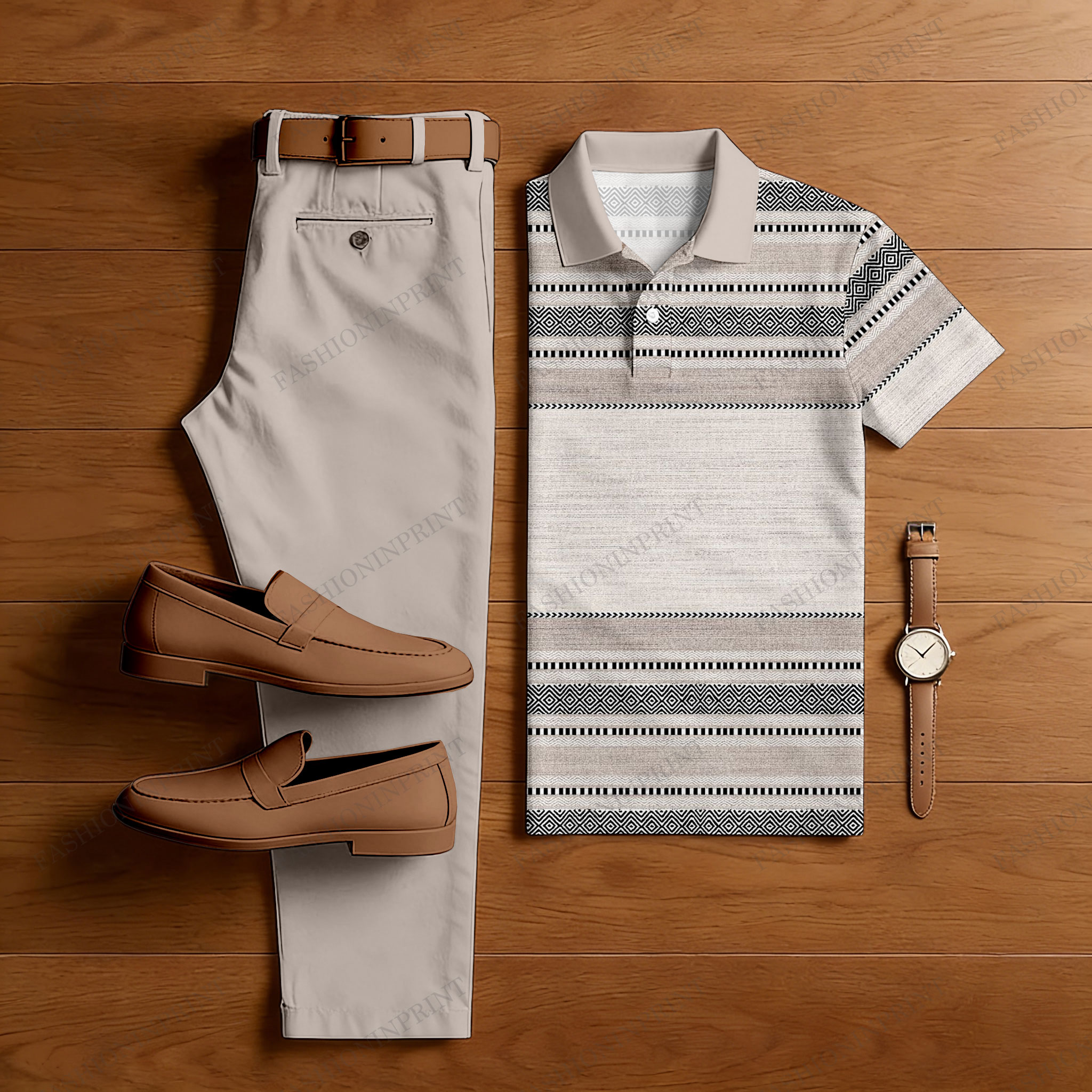 Men's Casual Light Brown Color Matching Ethnic Style Striped Printed Short Sleeved Polo Shirt & Trousers Two-Piece Set