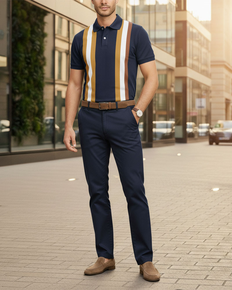 Men's Casual Navy Blue Color Matching Striped Printed Short Sleeved Polo Shirt & Trousers Two-Piece Set