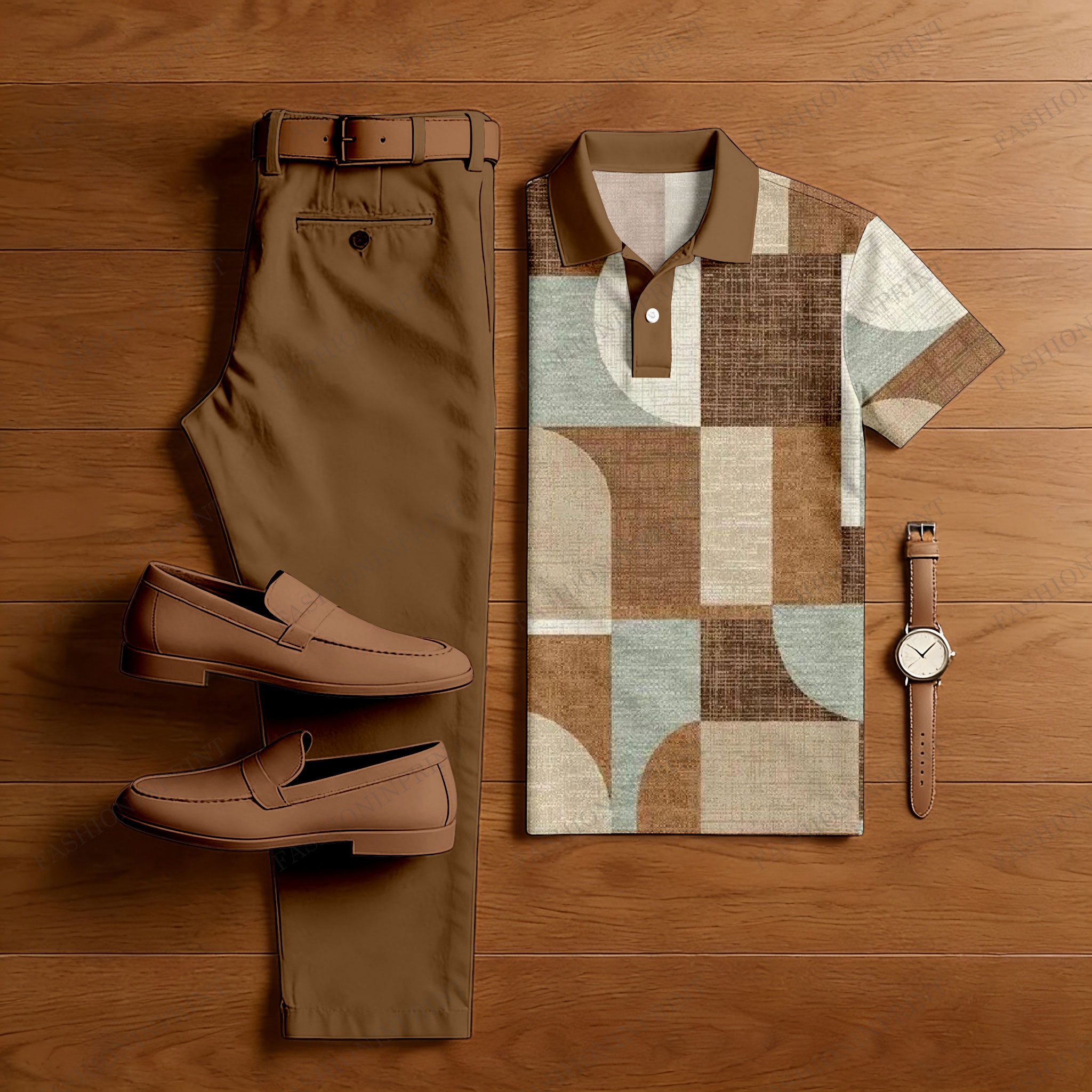 Men's Casual Brown & Khaki Green Color Matching Geometric Printed Short Sleeved Polo Shirt & Trousers Two-Piece Set
