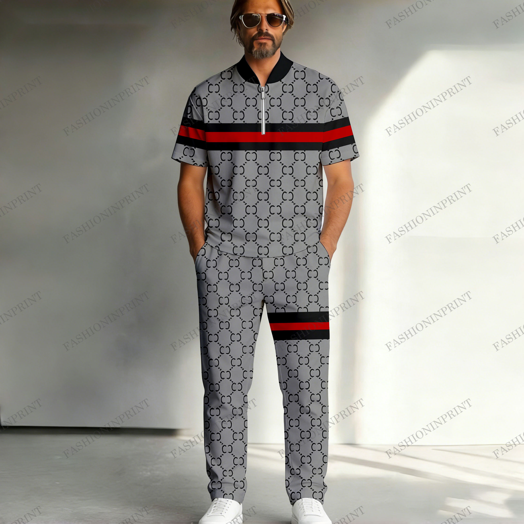 Men's Casual Gray & Black Color Matching Vintage Style Printed Short Sleeved Zipper Polo Shirt & Trousers Two-Piece Set