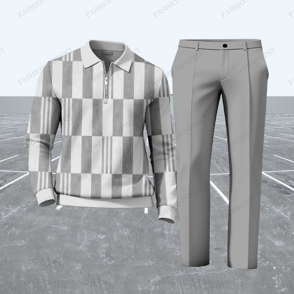 Men's Casual Gray Color Matching Checkered Printed Zipper Long Sleeved Polo Shirt & Trousers Two-Piece Set