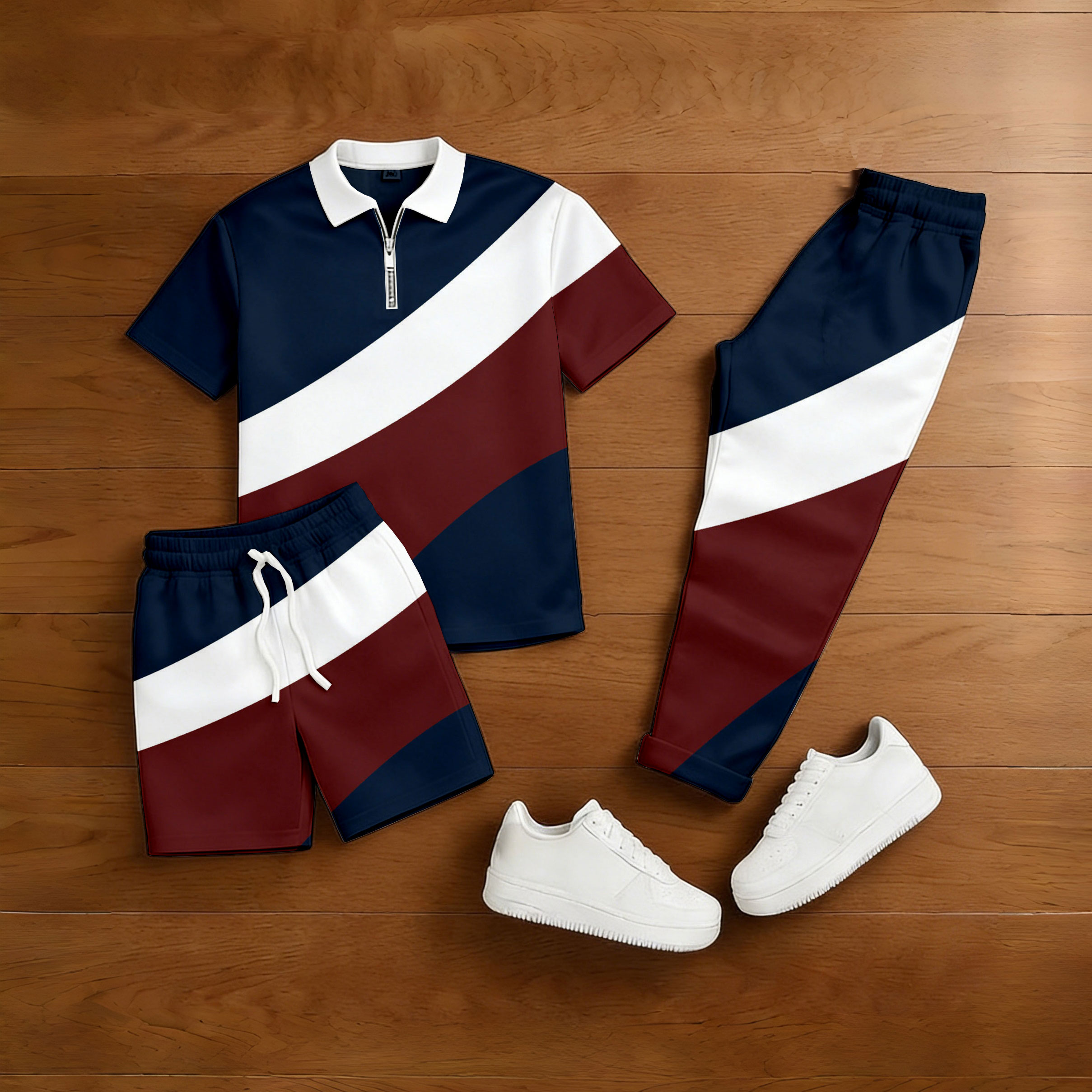 Men's Casual Maroon & Navy Blue Color Matching Printed Zipper Short Sleeved Polo Shirt & Trousers & Shorts 3Pc Set