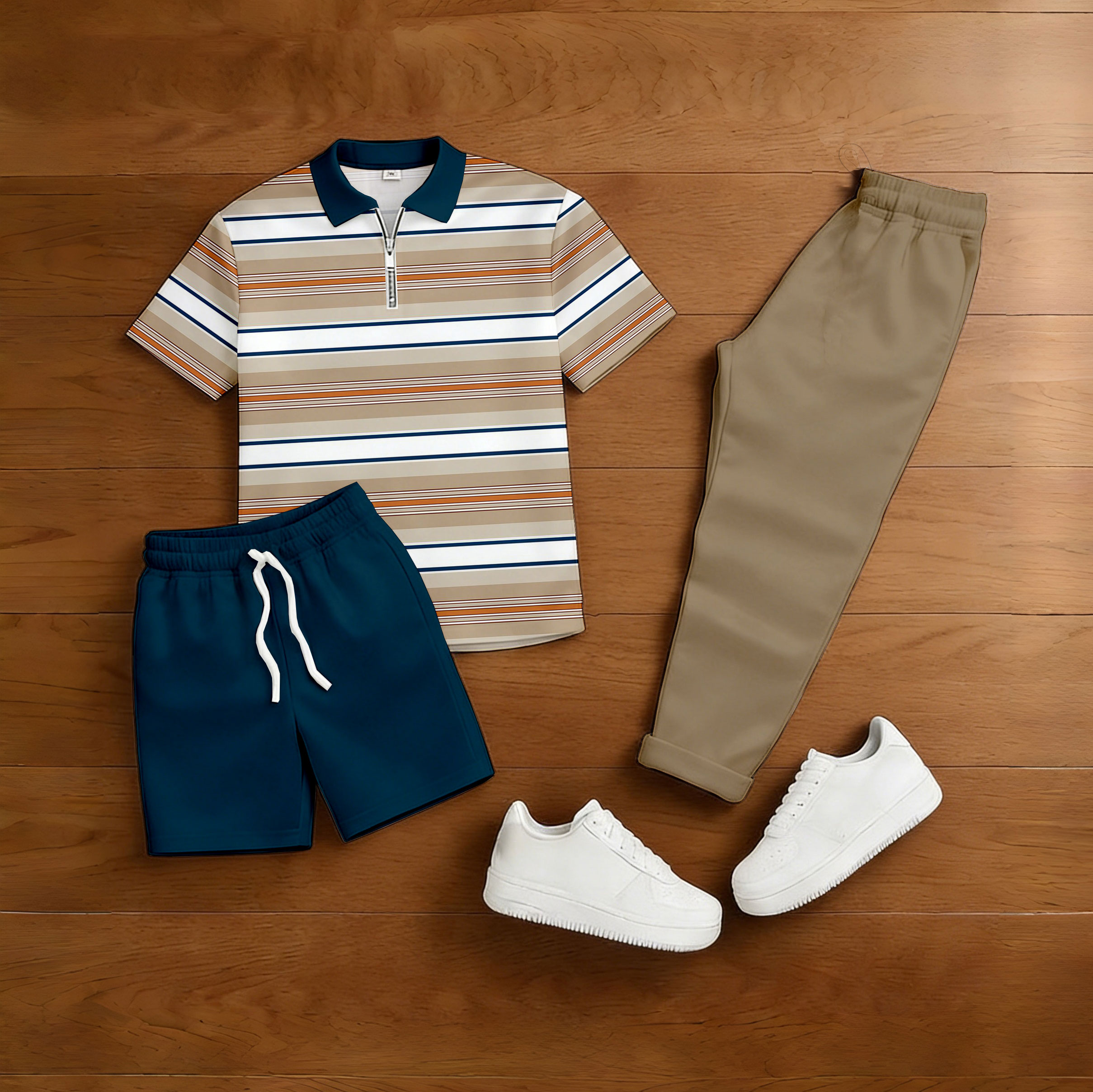 Men's Casual Navy & Khaki Color Matching Striped Printed Zipper Short Sleeved Polo Shirt & Trousers & Shorts 3Pc Set