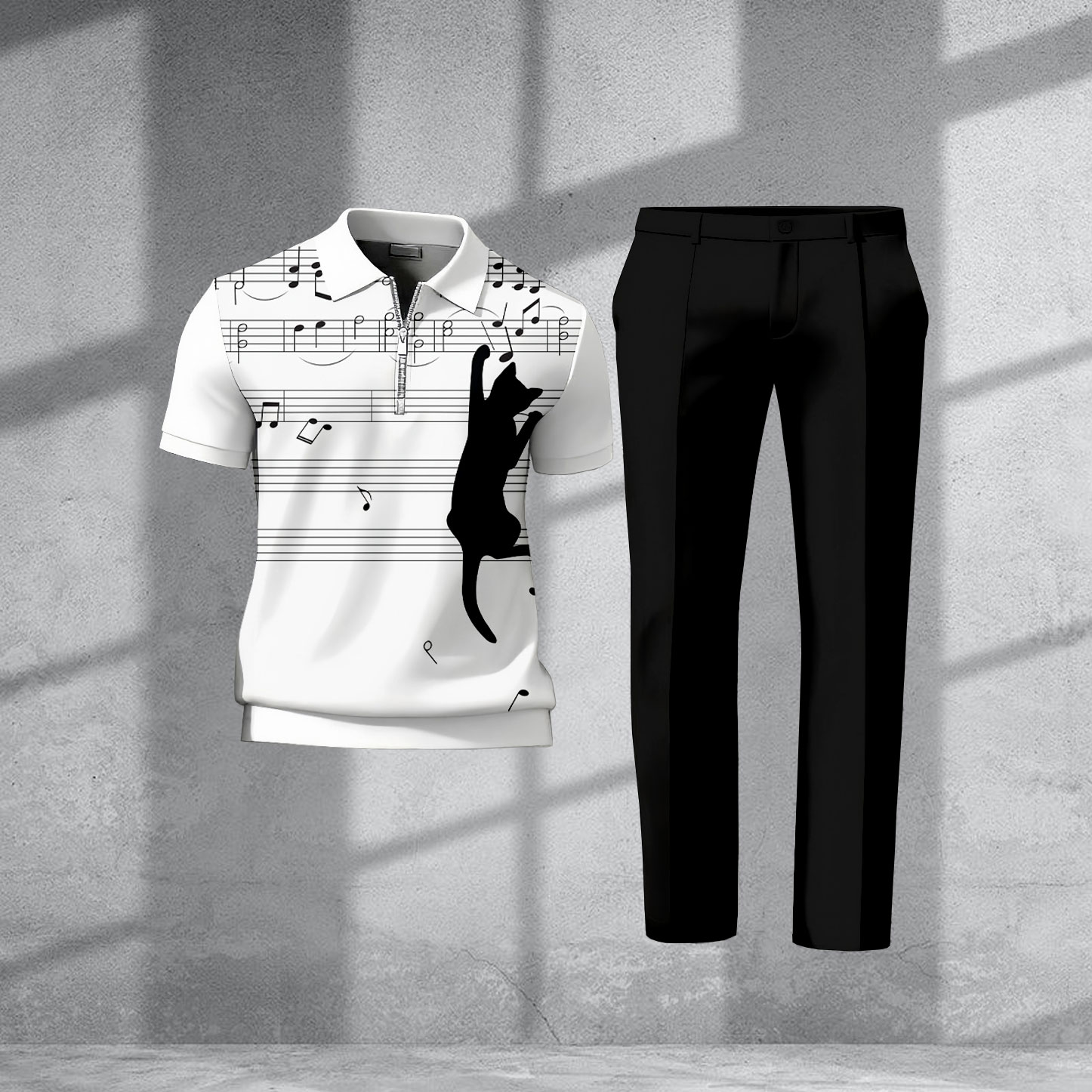 Men's Casual Black & White Color Matching Music And Cat Printed Zipper Short Sleeved Polo Shirt & Trousers Two-Piece Set