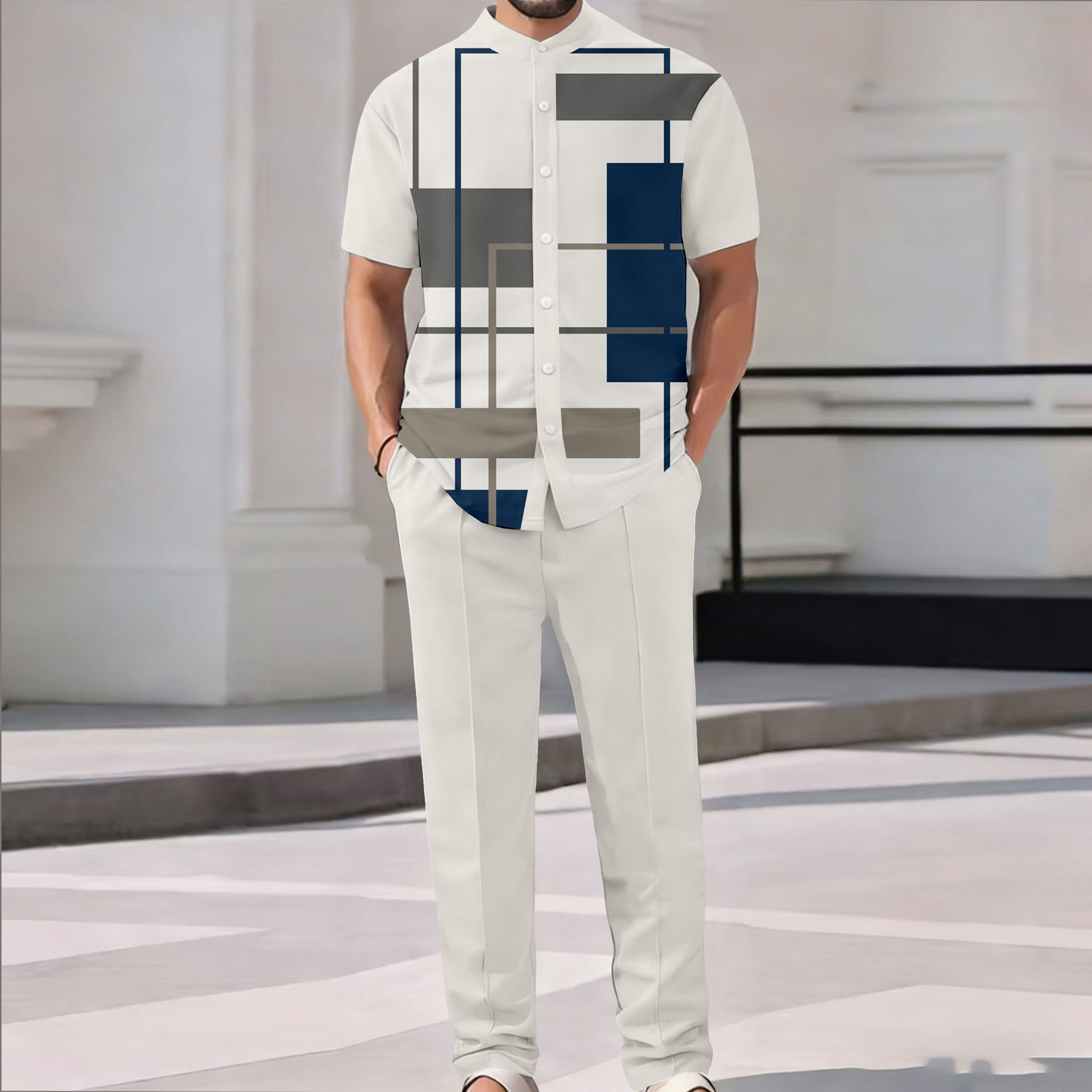 Men's Casual Light Gray Color Matching Geometric Printed Short Sleeved Shirt & Trousers Two-Piece Set