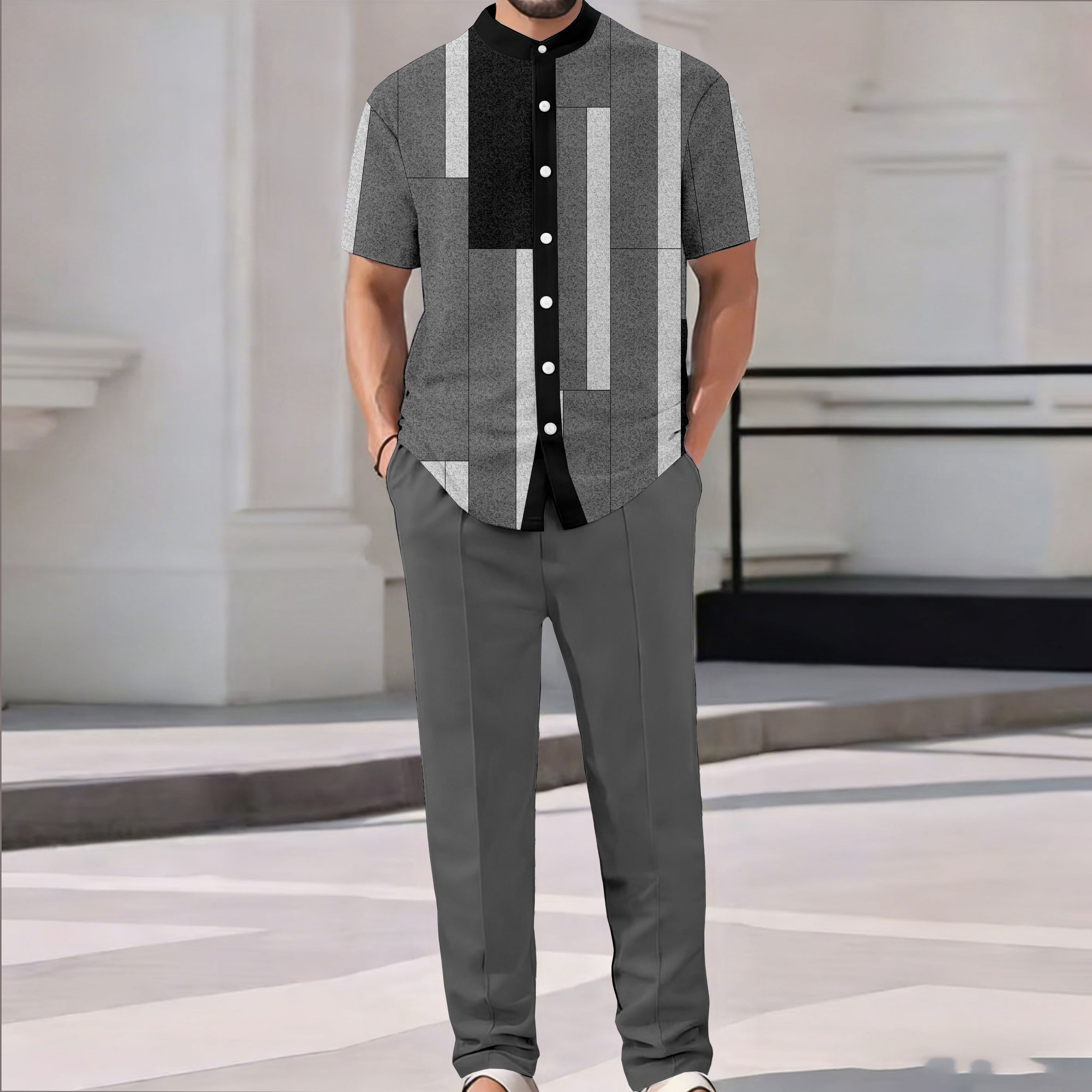 Men's Casual Gray & Black Color Matching Geometric Printed Short Sleeved Shirt & Trousers Two-Piece Set