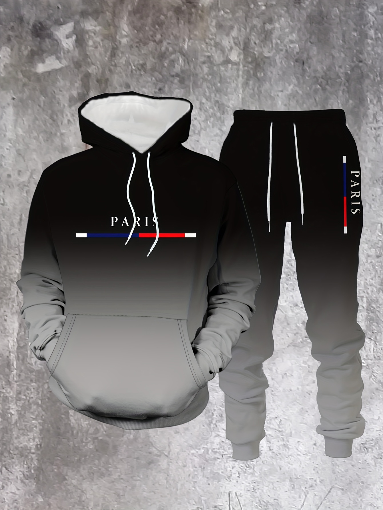 Men's Casual Black Gradient Color Printed Hoodies Long Sleeved Sweatshirts & Sweatpants Two-Piece Set
