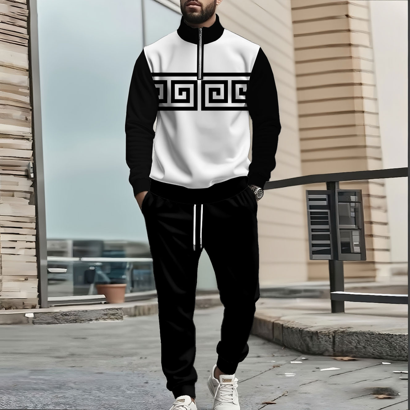 Men's Casual Colorblock Print Long-Sleeved Zipper Stand-Up Collar Sweatshirt And Pants Two-Piece Set