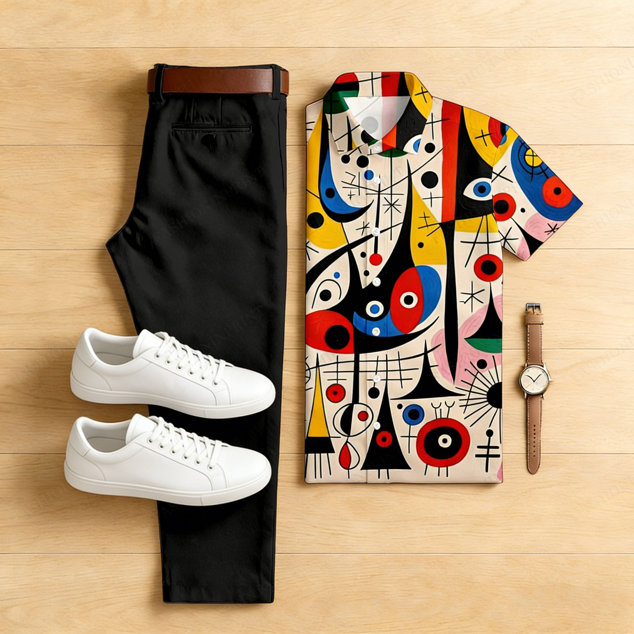 Men's Casual Colorful Graffiti Printed Polo Shirt And Trousers Two-Piece Set