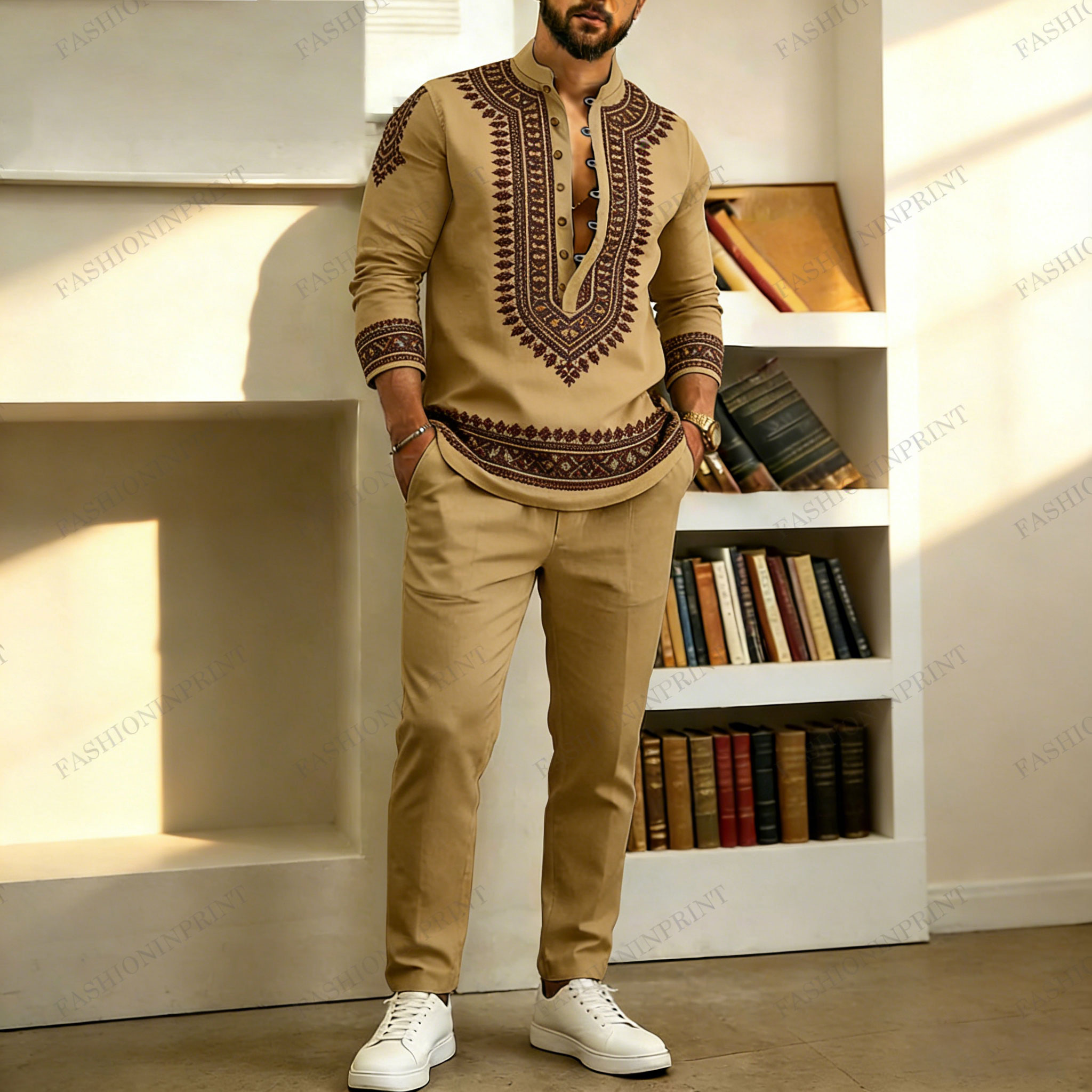 Men's Casual Cotton Khaki Personality Linen Long-Sleeved Henley Shirt And Trousers Two-Piece Set