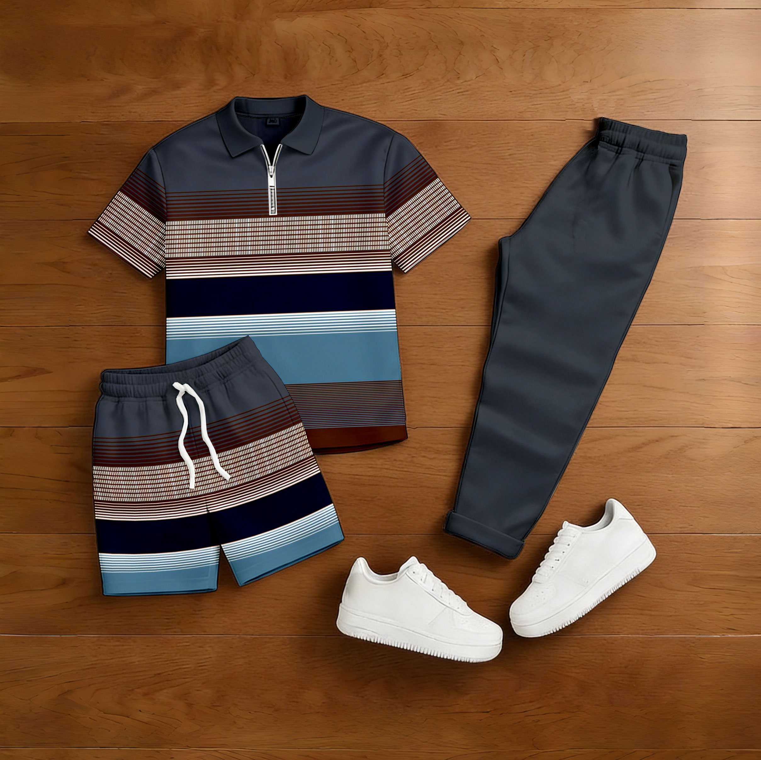 Men's Casual Dark Gray & Multi Color Matching Striped Printed Zipper Short Sleeved Polo Shirt & Trousers & Shorts 3Pc Set