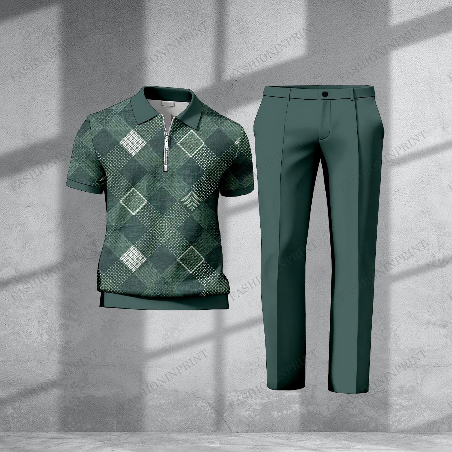 Men's Casual Dark Green Color Matching Checkered Printed Short Sleeved Zipper Polo Shirt & Trousers Two-Piece Set