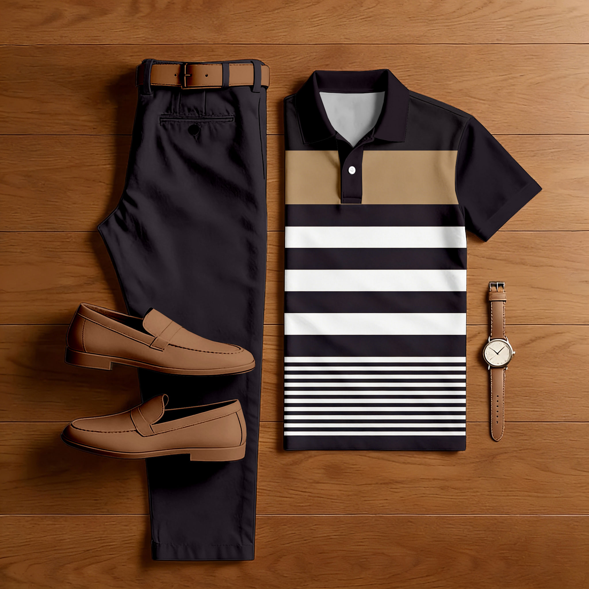 Men's Casual Deep Purple & White Color Matching Striped Printed Short Sleeved Polo Shirt & Trousers Two-Piece Set