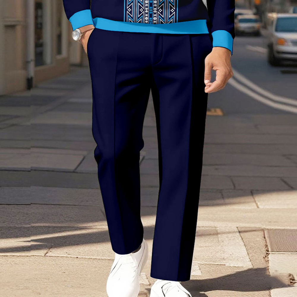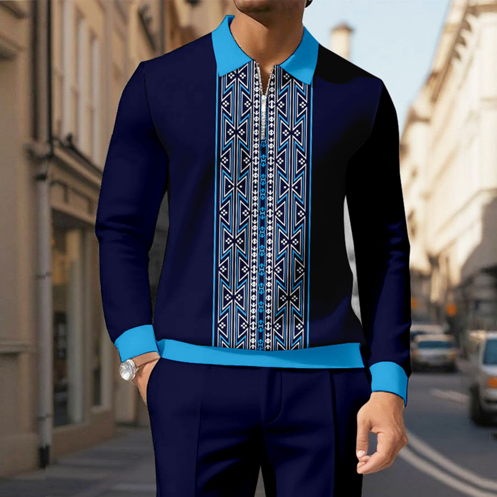 Men's Casual Ethnic Style Matching Printed Polo-Collar Zipper Long Sleeved Trousers Navy Blue Two-Piece Set