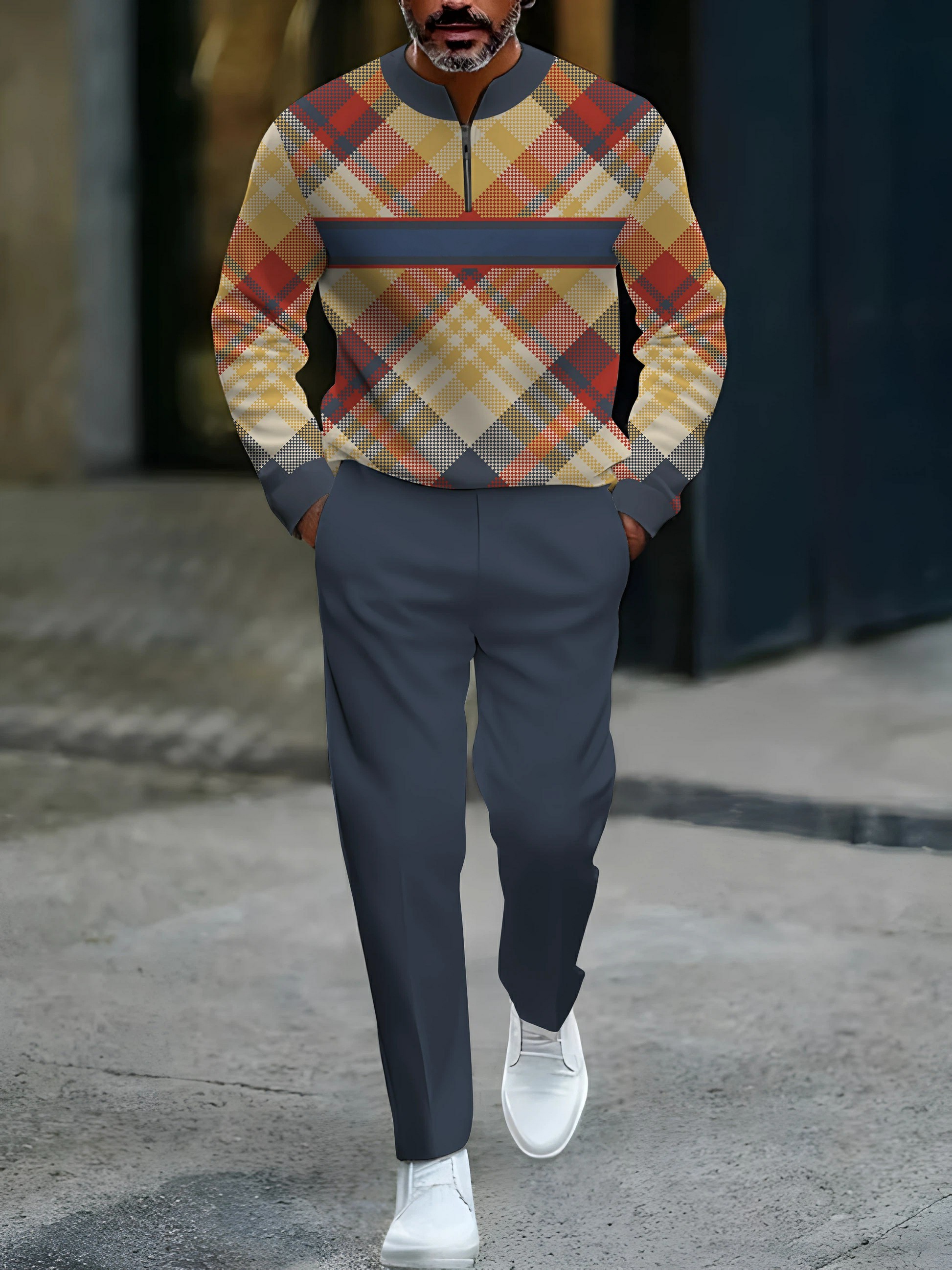 Men's Casual Gary & Multicolored Color Matching Checked Pattenr Round-Neck Zipper Long Sleeved Tops & Trousers Two-Piece Set